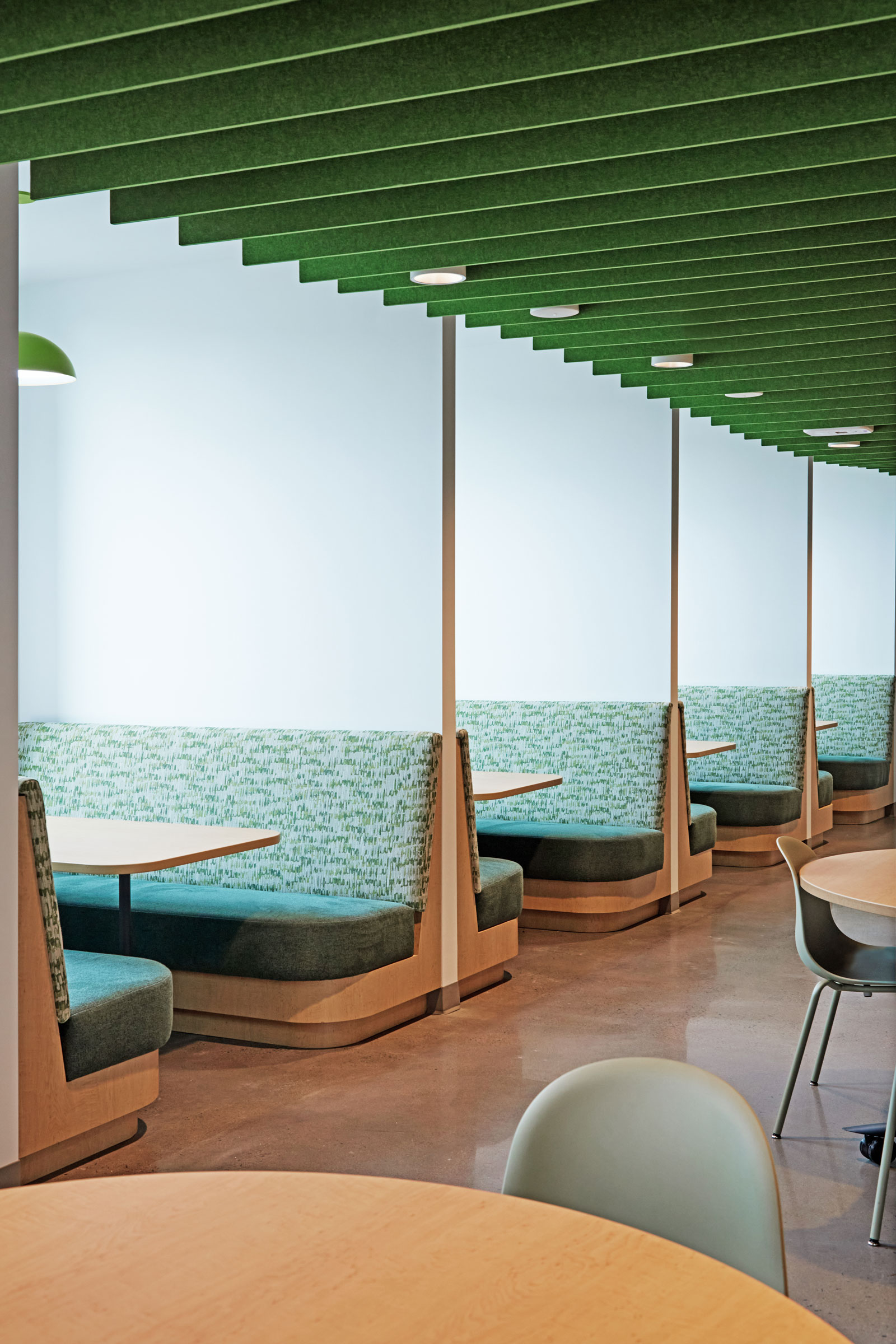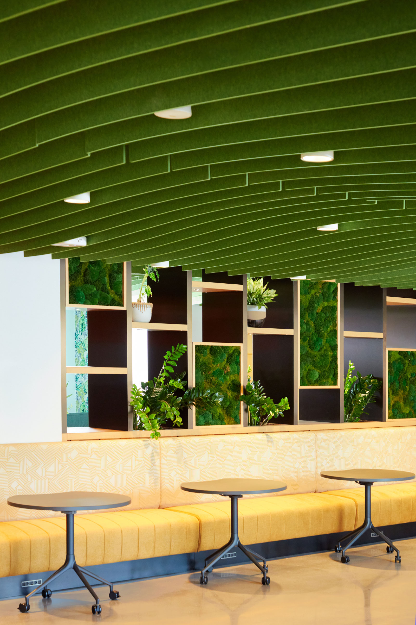 - Biophilic elements include an undulating acoustic baffle made of recycled PET plastic felt from Turf. Photo by Chris Rogers