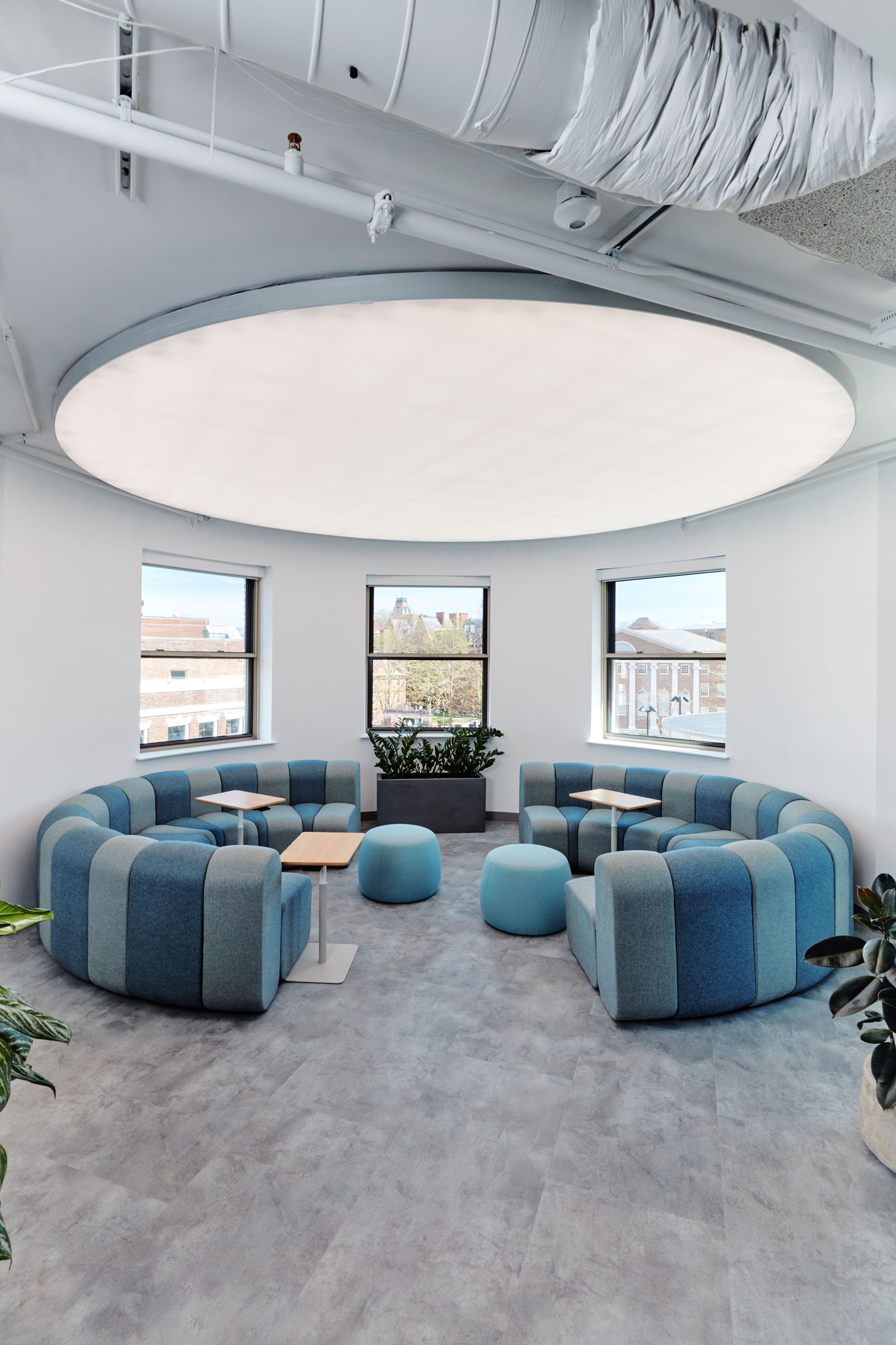 Circadian lighting gradually dims after business hours, providing enough “tuned” light to continue working, but preventing late-night brainstorming sessions from interfering with sleep schedules. “The building is telling you that maybe you should get some rest,” Ross says.