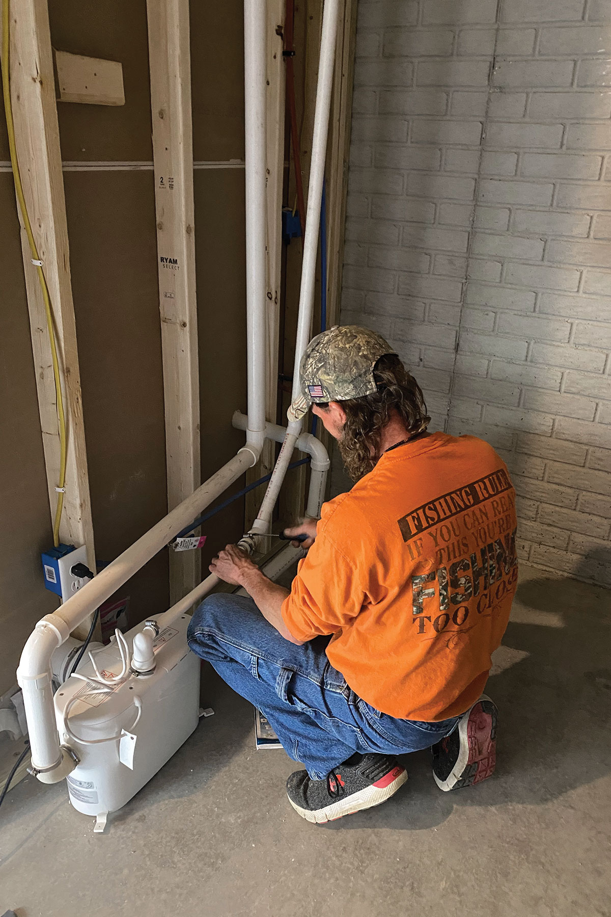 Above-ground plumbing can be used for upper-level additions or renovations, and the macerating pump technology can accommodate other bathroom needs, too. “The system has inlets to connect the shower and the sink, so a complete bathroom drains into it,” Pachas says. “Our pump will grind everything up and pump it out on demand.”