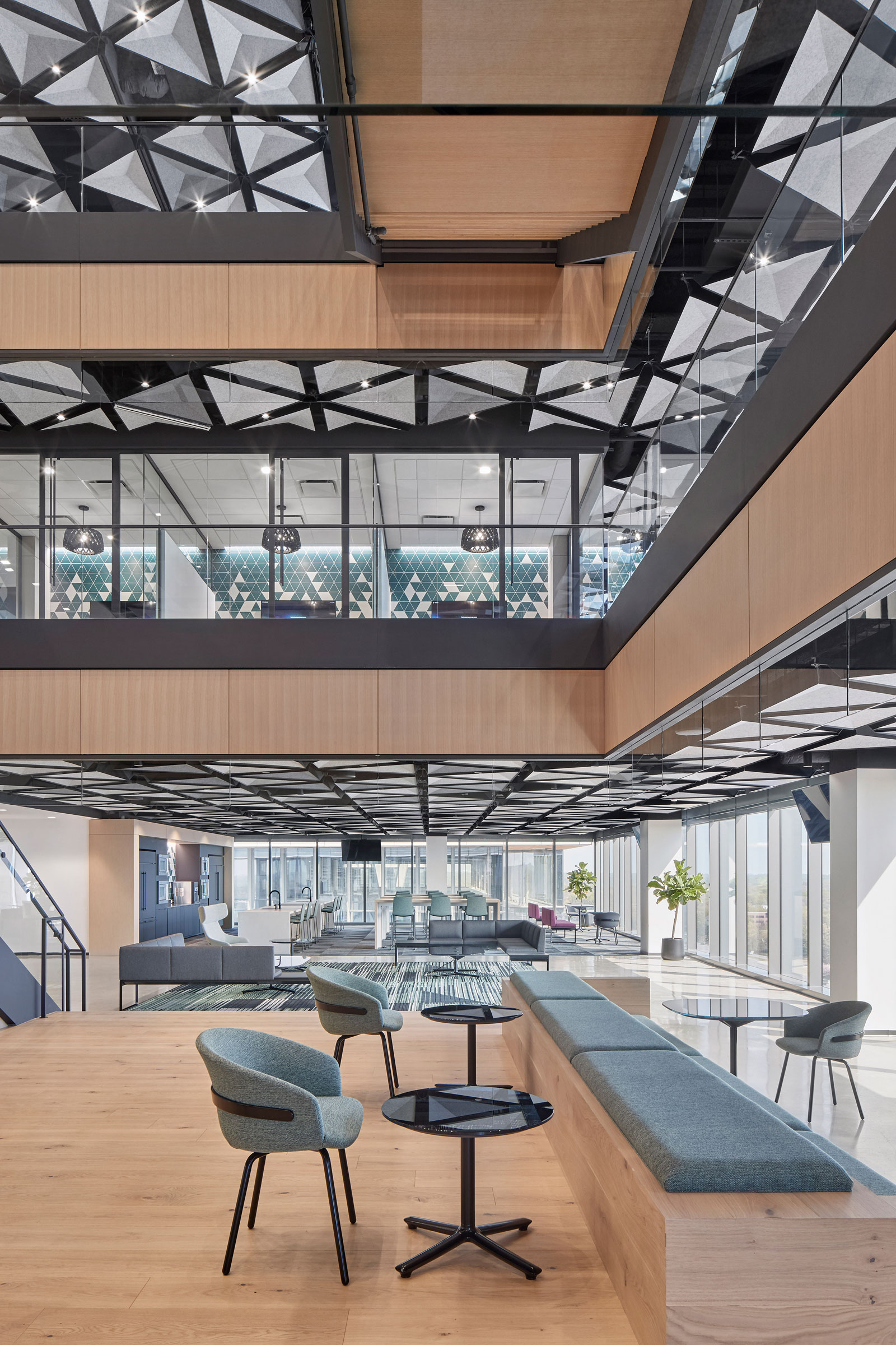 - TriSoft geometric acoustic modules on all three levels of this commercial space bring a cohesive look to an overall project. Photo by Jenn Verrier