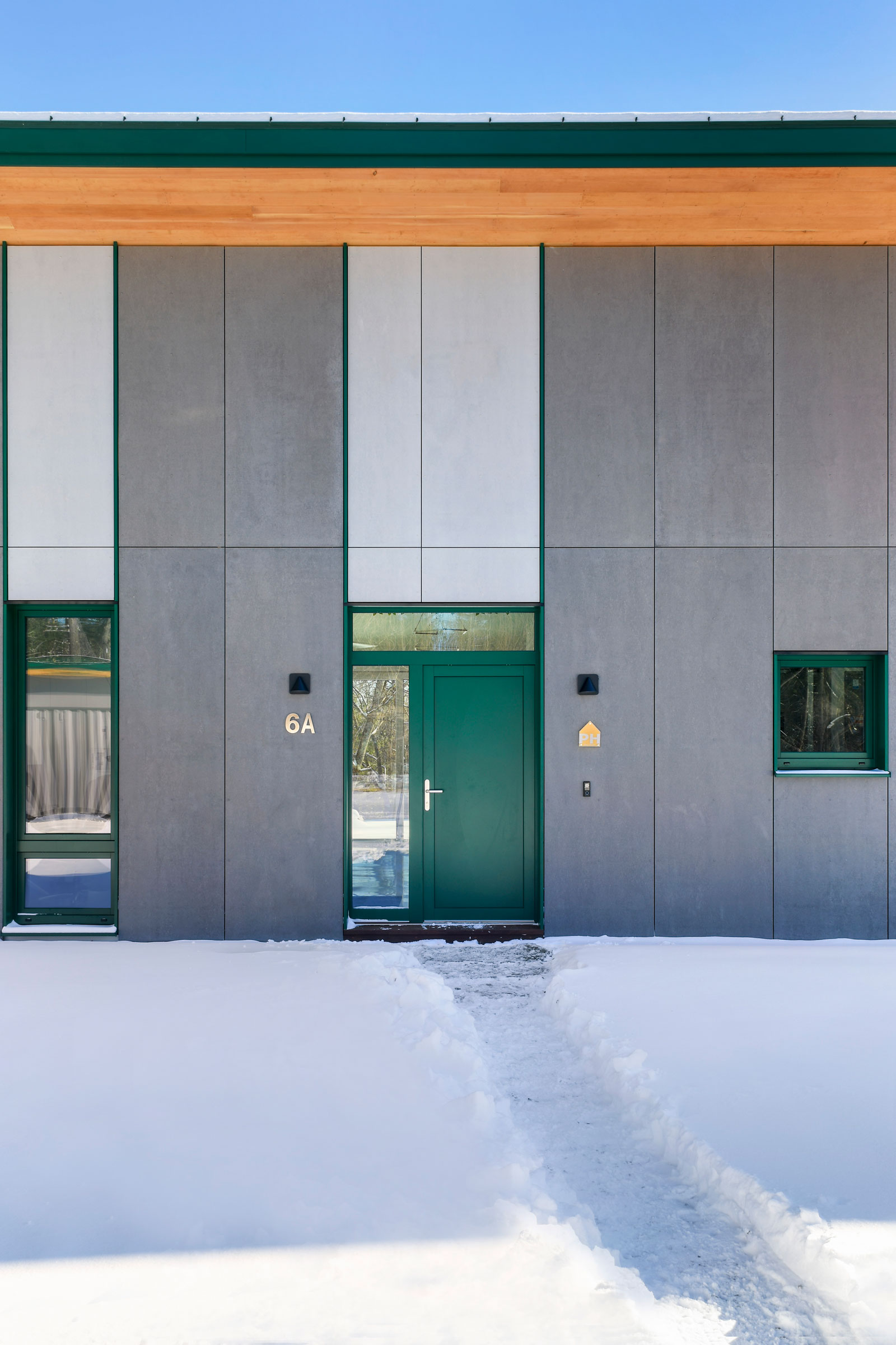 The exterior walls are mostly made of colored fiber cement by Cement Board Manufacturers. The roof is by Drexel Metals and features wood accents along with eaves. At night sconces on either side of the front door light up for wayfinding. Photo by Nat Rea