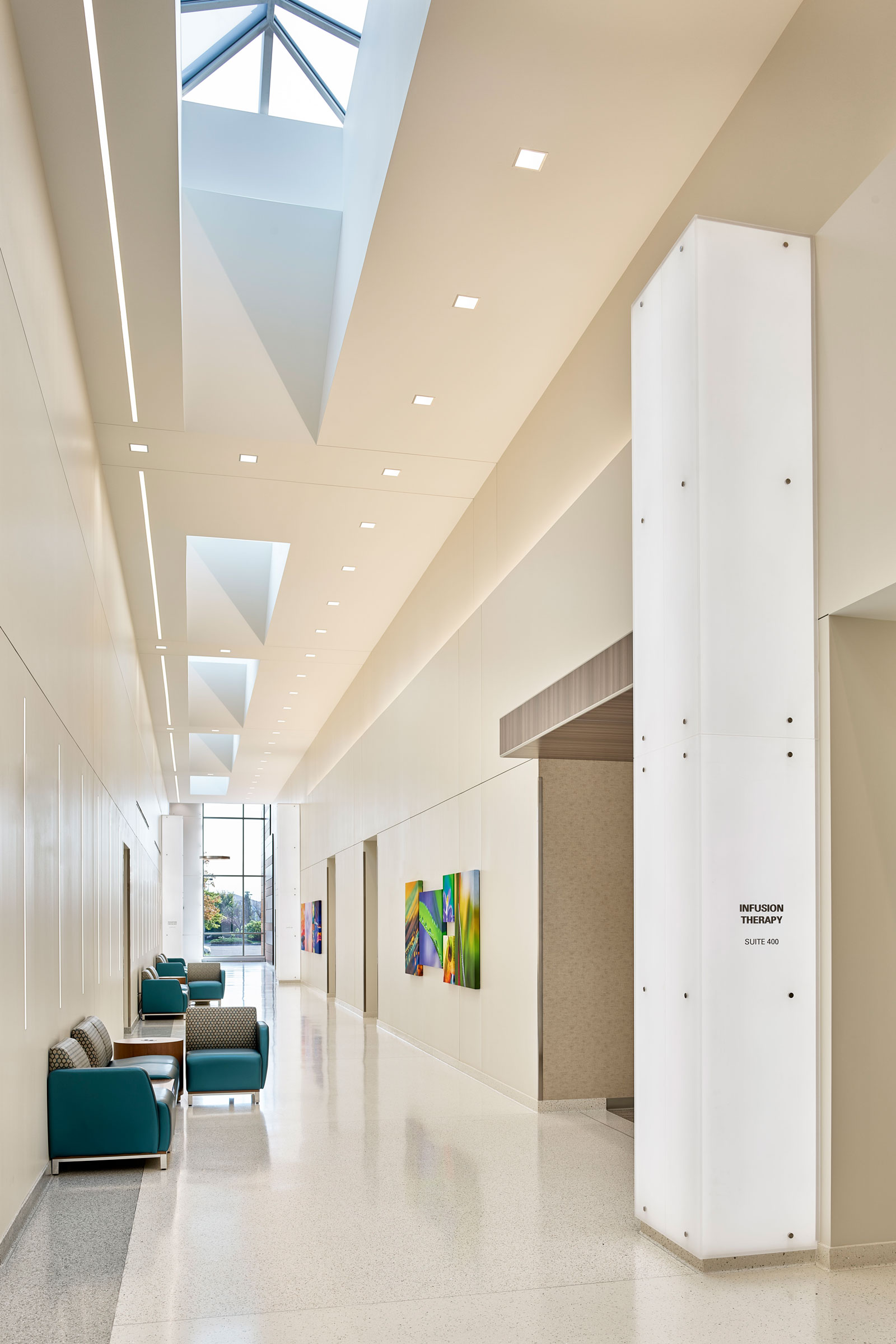 Skylights are used in the central circulation concourse where each destination entrance is located. The design team strategically placed treatment rooms, taking into consideration those patients who are sensitive to natural light versus those who aren’t.