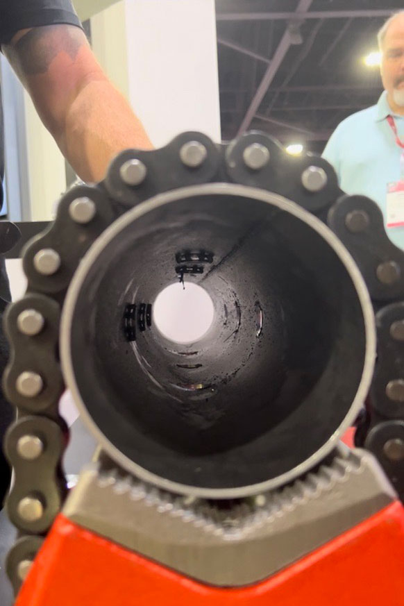 “This connection method is a press fit. You drill a square hole, insert the fitting with the clamp, and it pulls apart the metal tight against the inside of the pipe and seals the sealing element to the base,” Henkowski says. “We’re taking something that’s normally a 20- to 25-minute weld and the most likely to leak weld on the job because it’s a hard weld—there are a lot of angles to hit—and we’re turning it into a minute to a minute-and-a-half press connection. We can do that from an inch-and-a-half all the way up to a six-inch pipe with a three-quarter inch threaded outlet on it.”