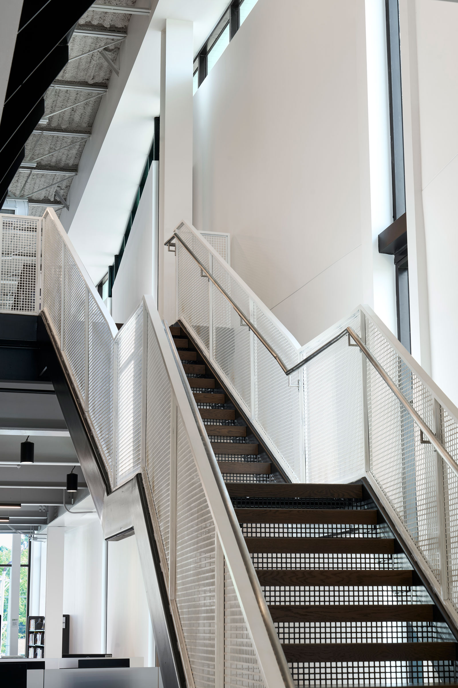 Thoughtfully placed windows and limited glazing—of which the building has less than 30%—provide natural lighting for comfortable reading and working. The majority of the glazing is on the north side, where diffused light comes into what feels like a treehouse on the second floor, home to the children’s and young adult collections. On the first floor HASTINGS dropped the height of some windows to reduce glare on future presentations and events that would happen in those spaces.