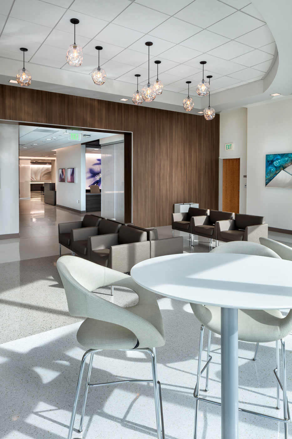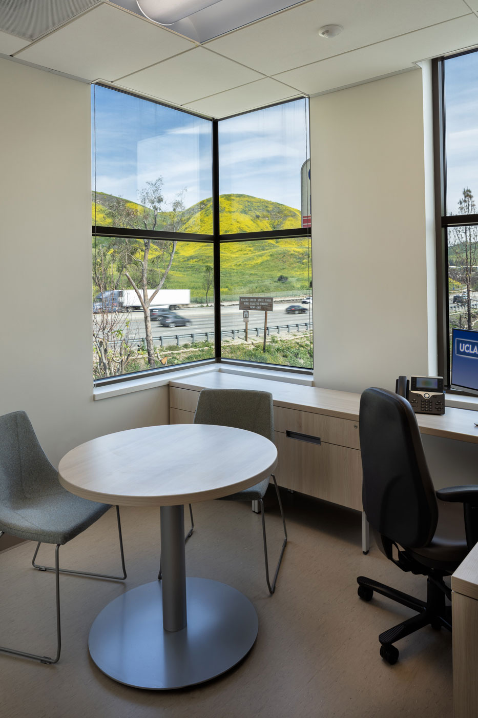 Overhead, lighting is just as important to the experience. Inside Calabasas, hanging glass pendants warm up a light-filled lobby space with large, plentiful windows. The area near the entrance gives patients and their loved ones another place to wait, work, or socialize in between appointments. “Maybe they go to advanced imaging at one point and they see their primary care physician later, and they need to spend a half-hour in between appointments,” Kraft says. “Here they can do so in an environment that allows them to relax.” High tables near windows overlooking rolling hills provide a bit of respite and more of a coffee shop feel, where they can enjoy a snack. “It’s a way to make that area feel special and make it a living room type environment,” Kraft says.