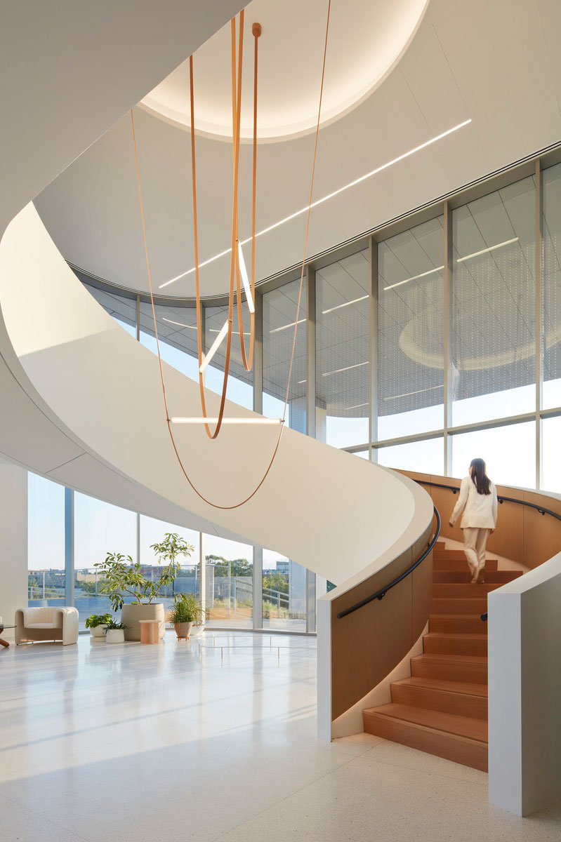 The stair itself is prefabricated in three steel sections, designed and engineered to be self-supported. “It’s a really beautiful art piece and a nod to the ingenuity and the thinking behind life sciences,” Mukoyama says.