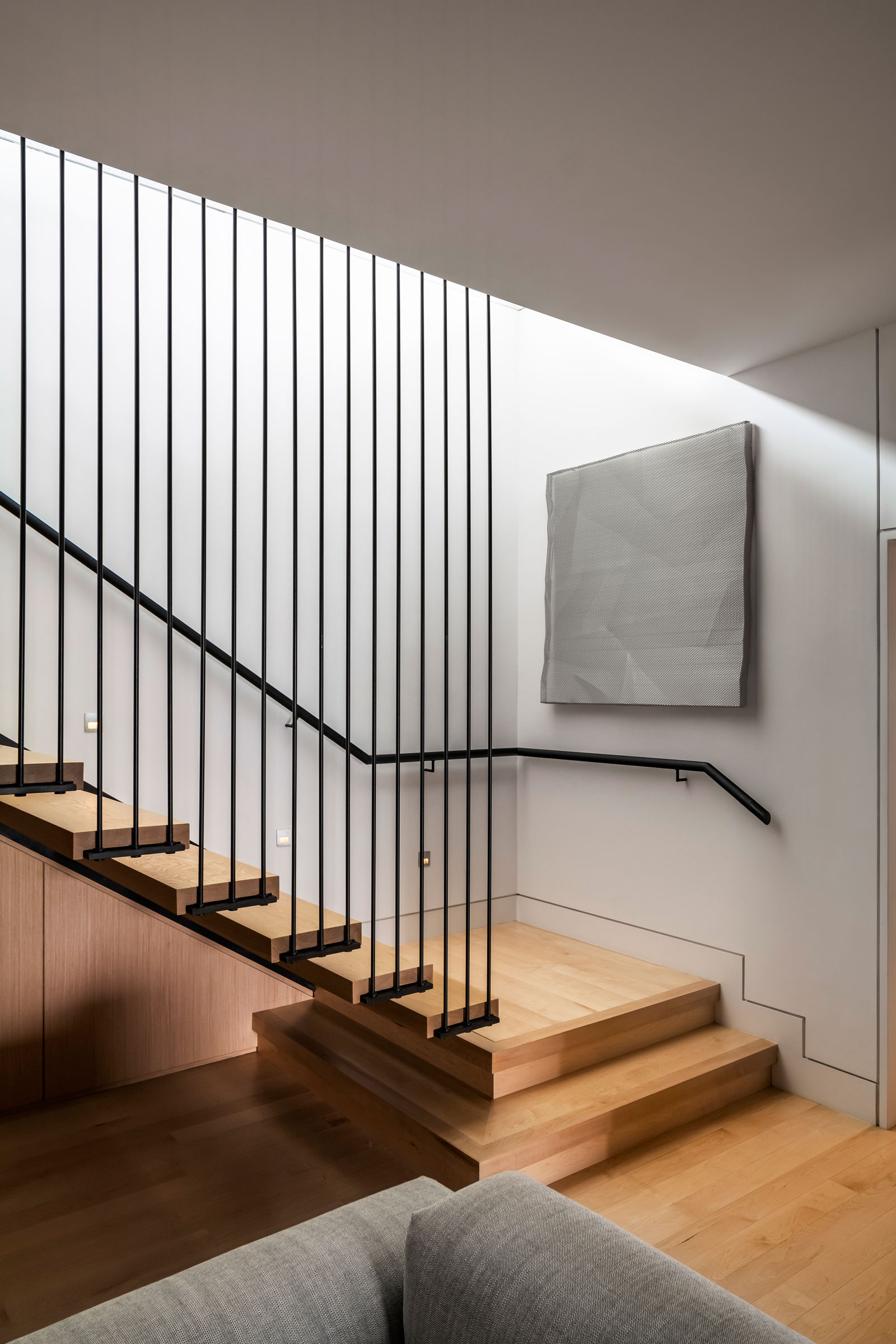 While performative aspects of the house were not necessarily part of the initial conversations with the client, GLUCK+ makes sustainability an intrinsic part of all of its designs. The folded overhanging roof was designed to create shade at any point in the day and offers enough space to discreetly house solar panels. Generated electricity can be bought and sold to the grid based on need. Large sliding glass doors allow for cross-ventilation. Thermal mass of earth helps insulate the lower level of the home and regulate temperature. The house is carefully zoned, allowing separate HVAC systems to remain off for large parts of the year. All lighting in the house is LED, and the garage hosts an electric car charger that acts as an emergency generator. Stormwater is collected and used for drip irrigation.