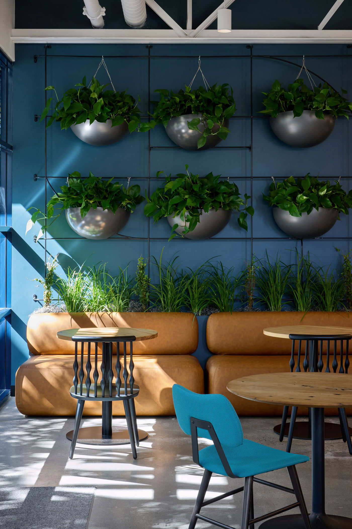 - The café space inside Gen features a green wall and plenty of natural light. Photo by Garrett Rowland