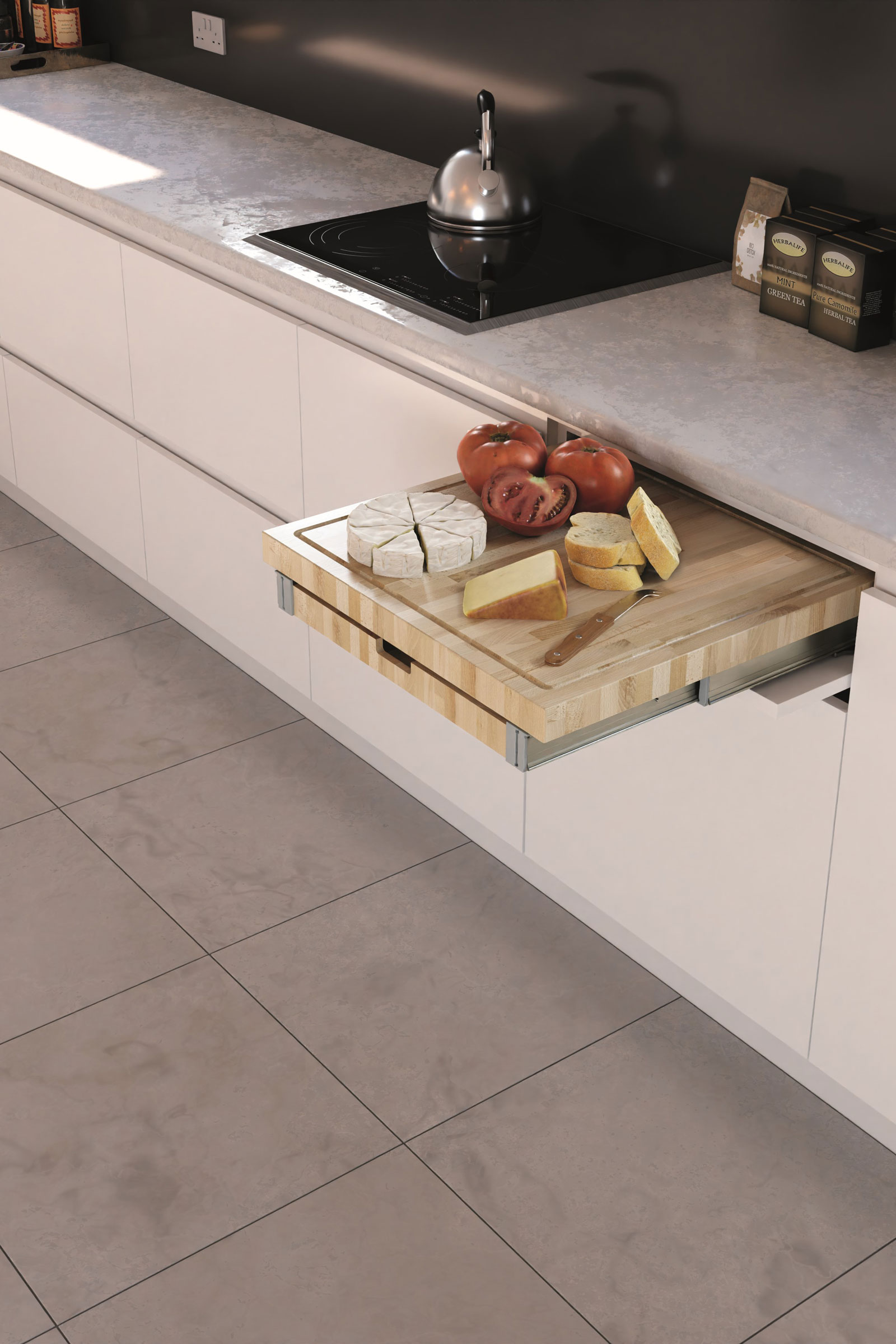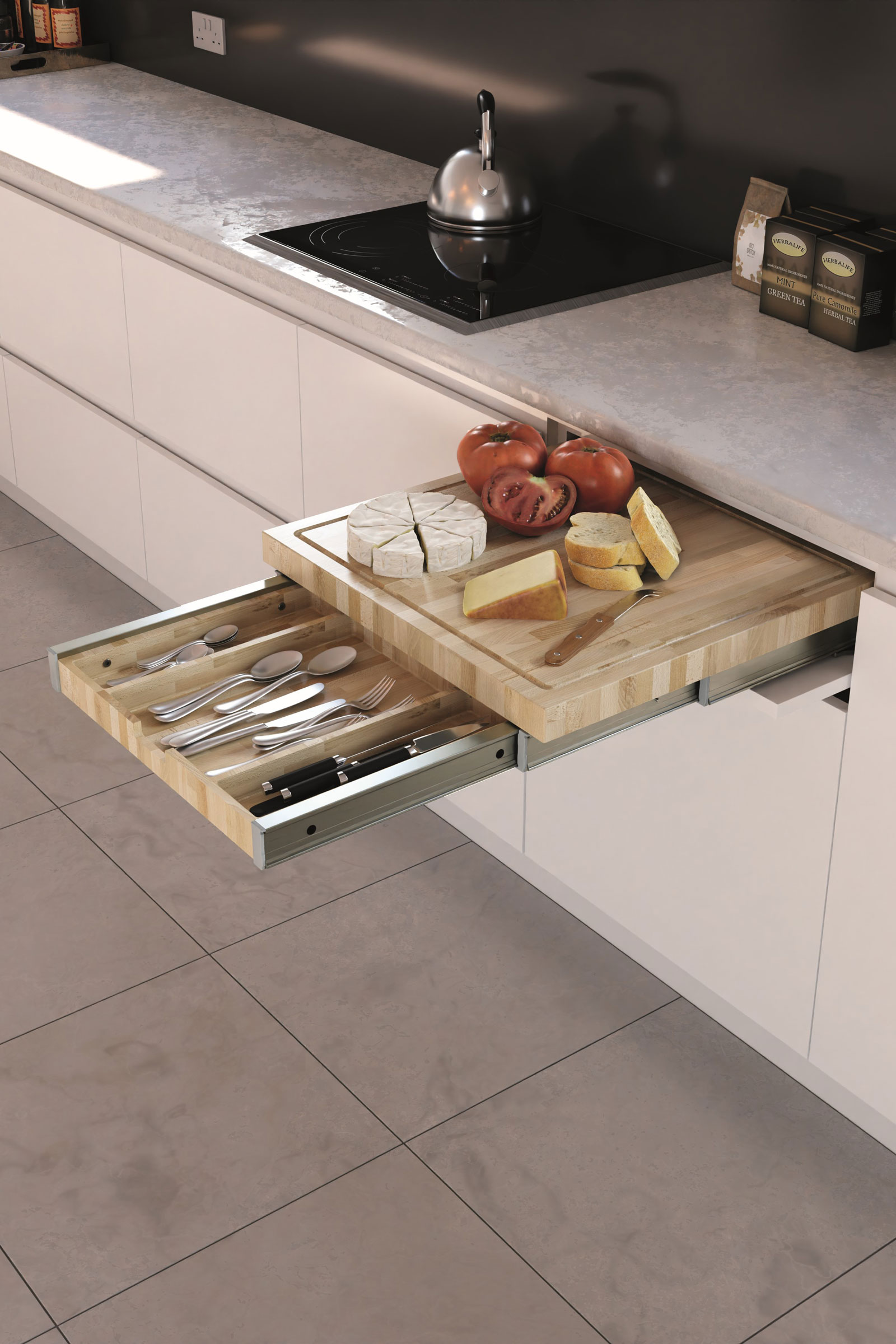 Alongside TRIGON Richelieu displayed BLADE—a dual-functioning cutting board and cutlery tray that can be pulled out as needed and retracted after use inside a standard drawer space in a 24-inch cabinet.