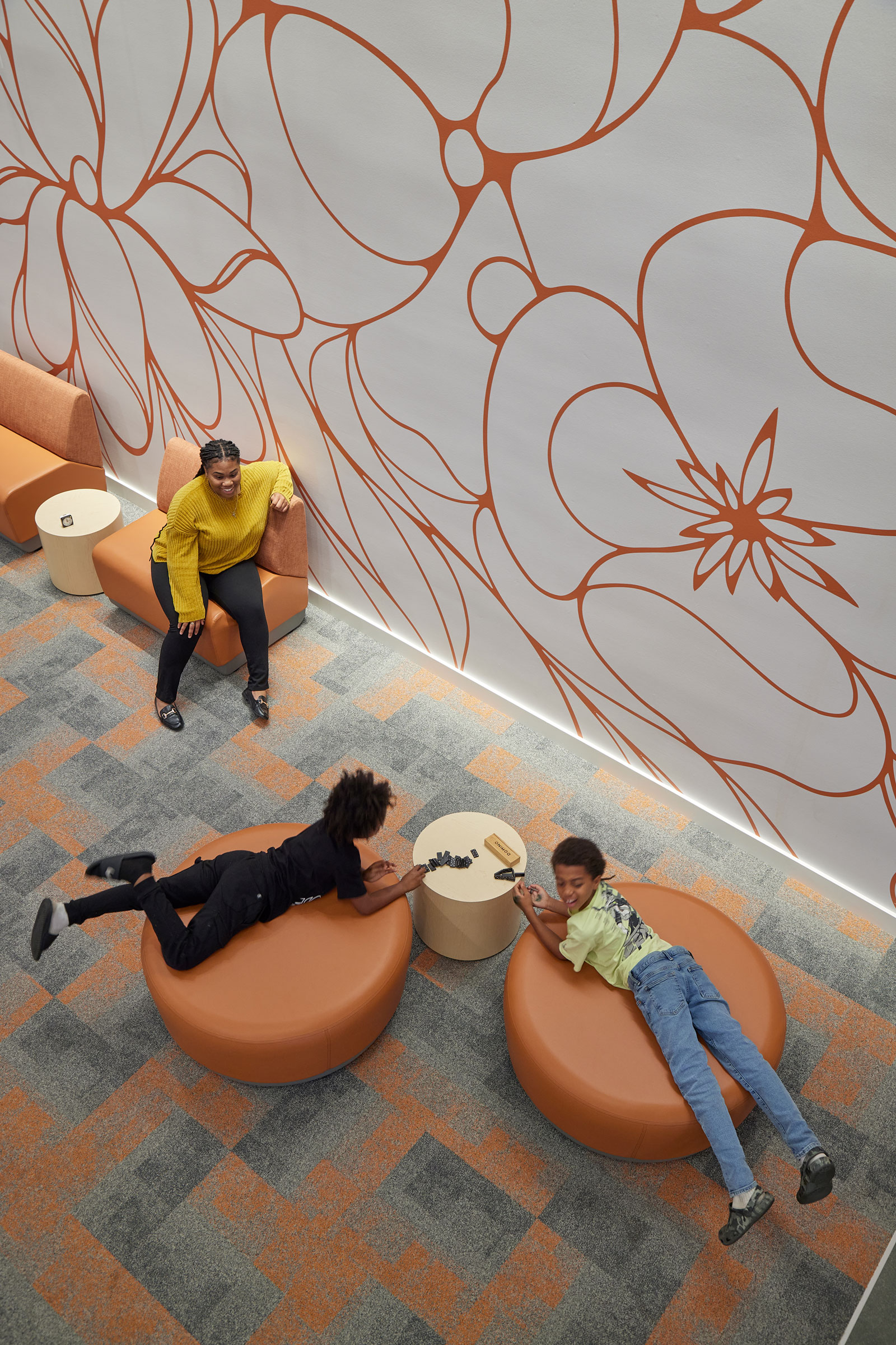 - Local artist Aaron De La Cruz made a sculpture that abstractly pictures his three children in the window of the community room overlooking the plaza. Photo Bruce Damonte, courtesy of Mithun
