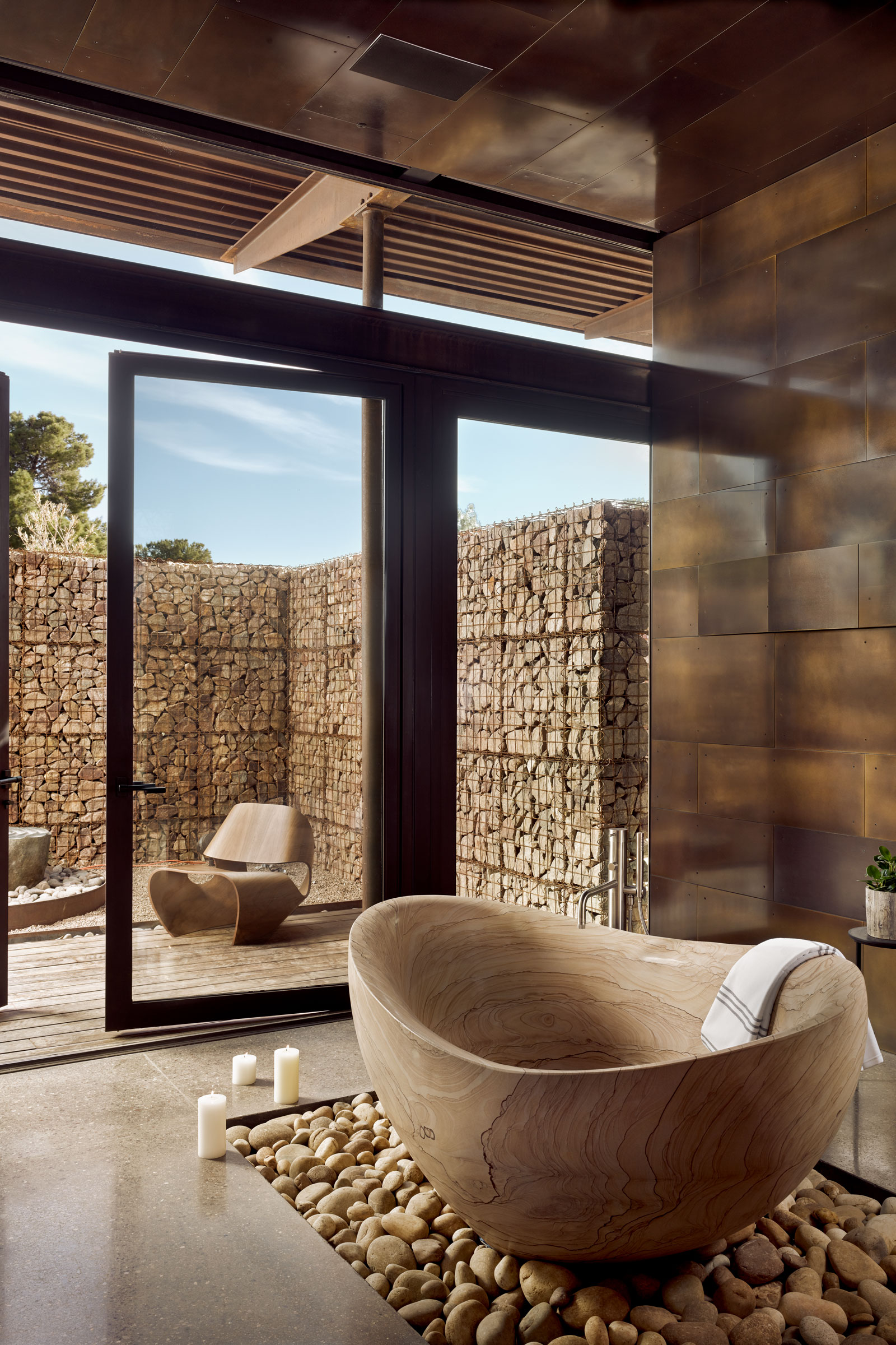 The materiality of the Courtyard House reflect the locale; the overhangs are constructed with Corten steel, a material that’s especially durable in dry climates. They’re supported by slender columns made from oilfield pipes, a nod to industrial Texas, that gives the building a refined but industrial look. The courtyard is defined by gabion walls made with local stone from the Franklin Mountains. “The craftspeople did an amazing job building them,” Raike says, “Watching them work was a real treat; they could just look at a stone and put it in like a jigsaw puzzle.”
