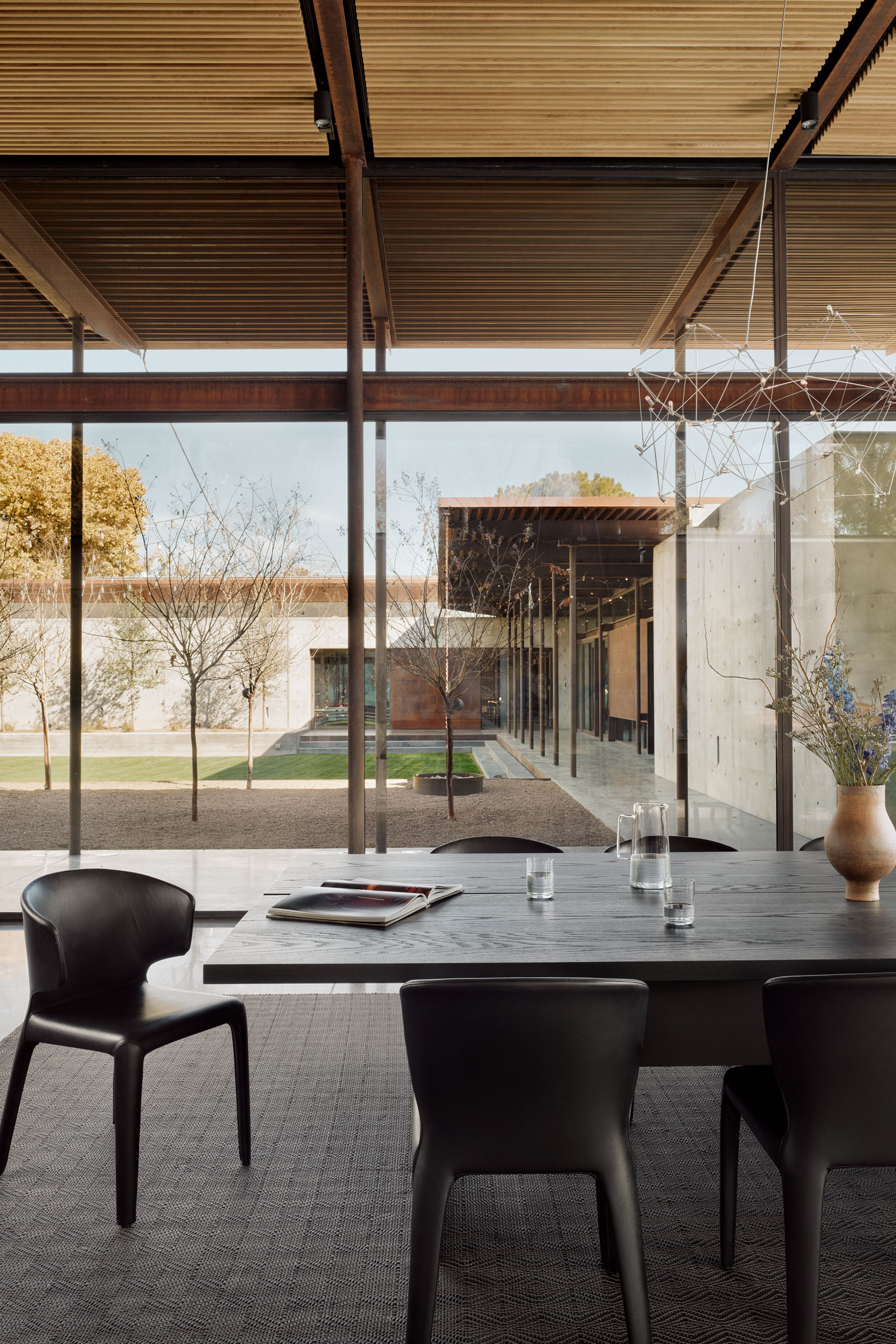 The Courtyard House organizes the family’s activities—a pool, an orchard, an outdoor kitchen, and 8-foot overhangs shading expanses of glass ensure a welcoming vibe. Inside the concrete home, two offices, a home gym, a spa, and a garage for a car collection make a meaningful destination. Interior walls of quarter-sawn walnut and slatted wood ceilings contrast with the harder exterior surfaces.