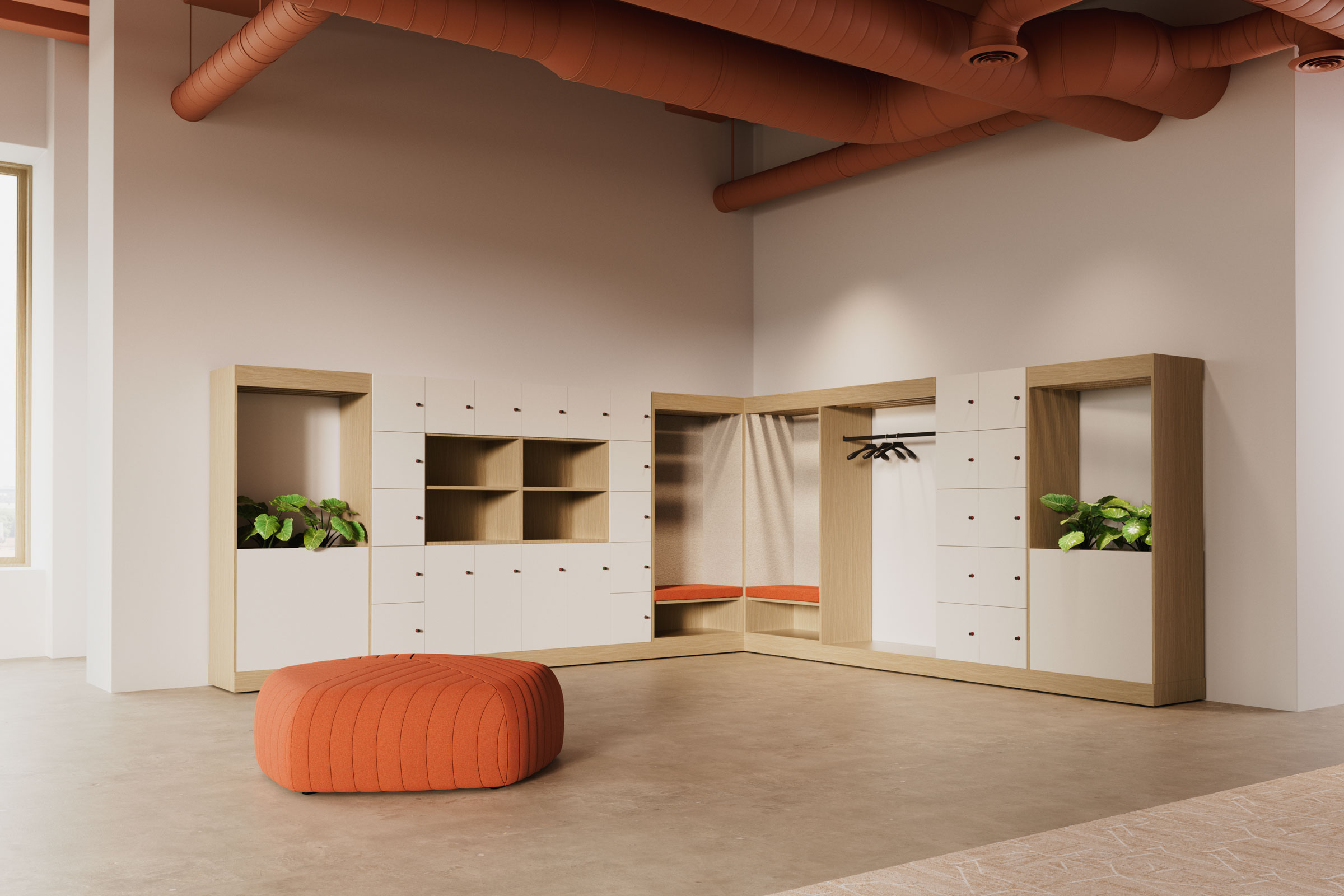 Three H’s research found a lot of people use lockers as space division, but people don’t always want solid volumes. Rendering by SEEN CGI, courtesy of Three H Furniture