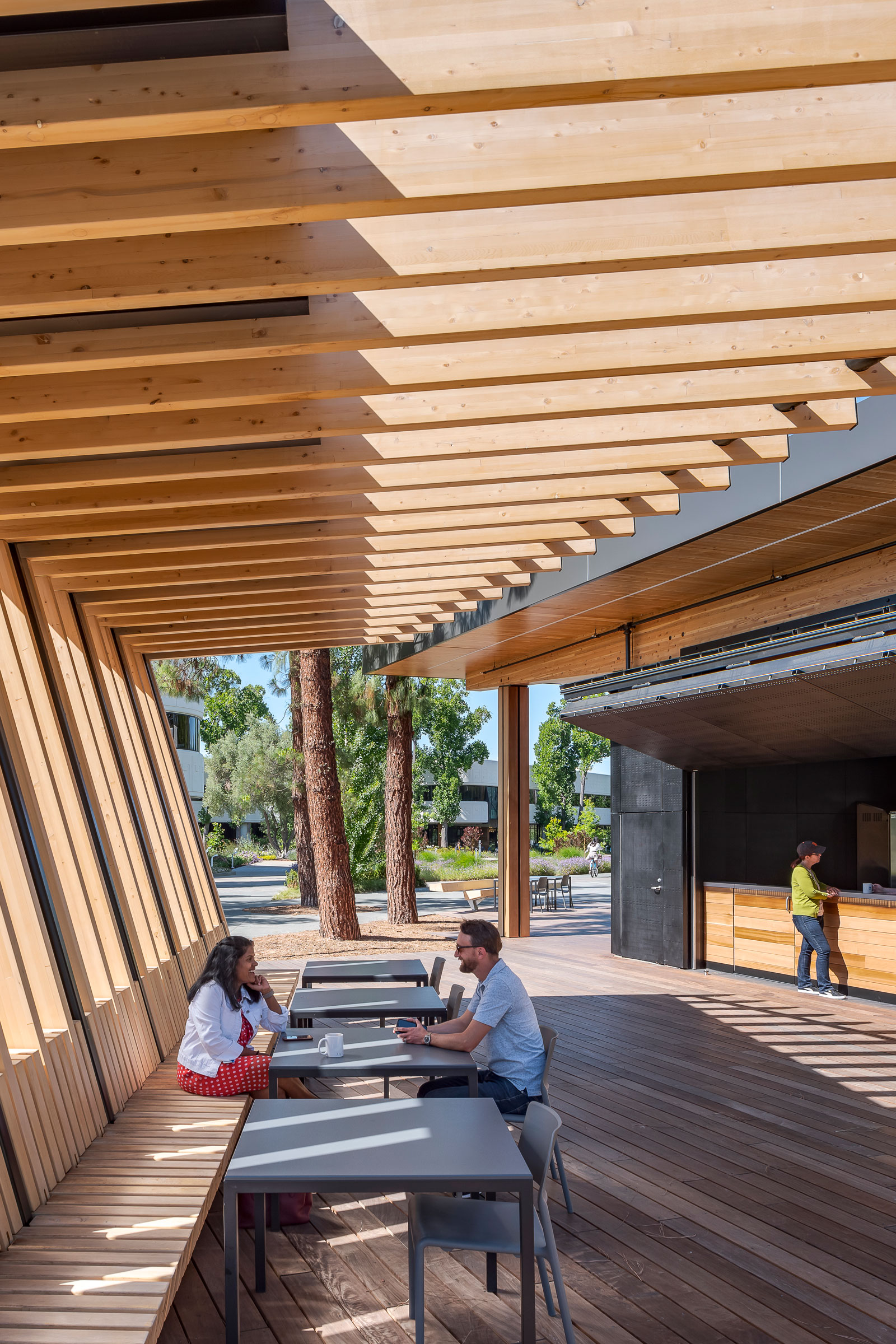 - The campus pavilion is a popular spot, hosting a coffee bar, happy hours, farmers’ markets, and other community events. At the center of the site STUDIOS and their client added a mass timber and steel structure to bring more energy to the space. Photo by Kyle Jeffers