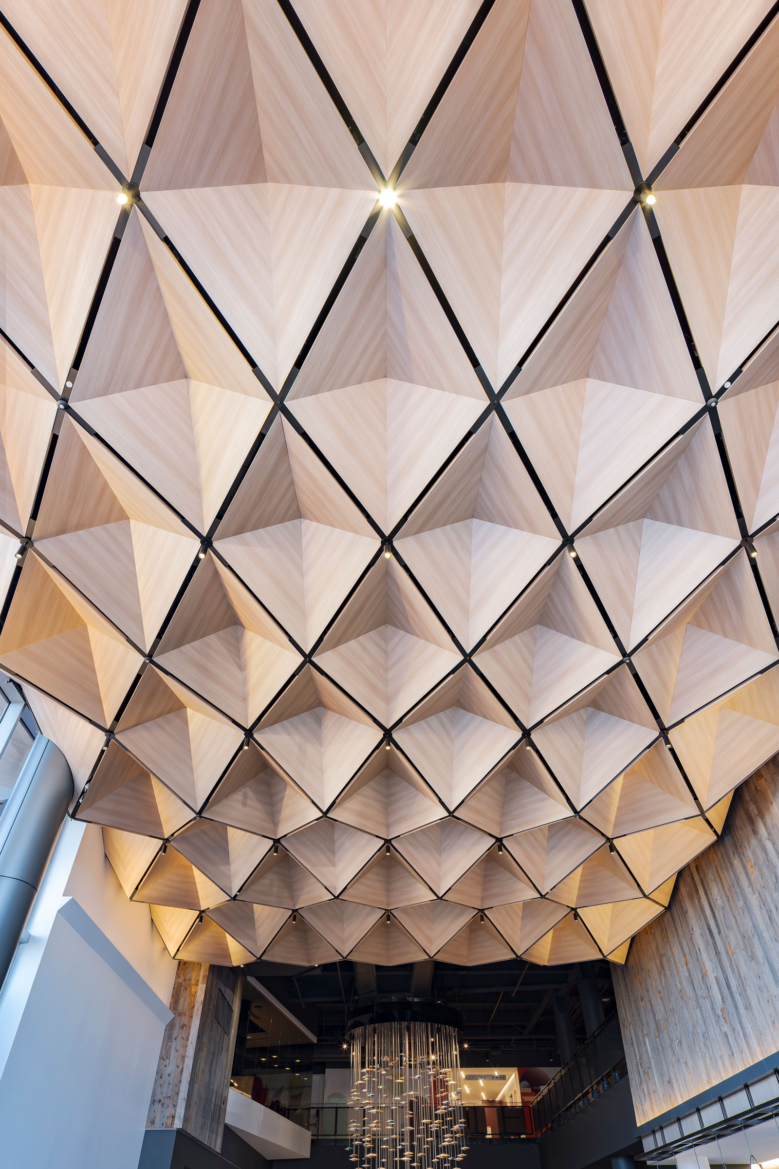 - The folding geometry of the wood ceiling is utilized to conceal deep tree wells on the third-floor deck and also engineered to have micro-perforations that provide excellent noise reduction for the lobby. Photo by Kyle Jeffers