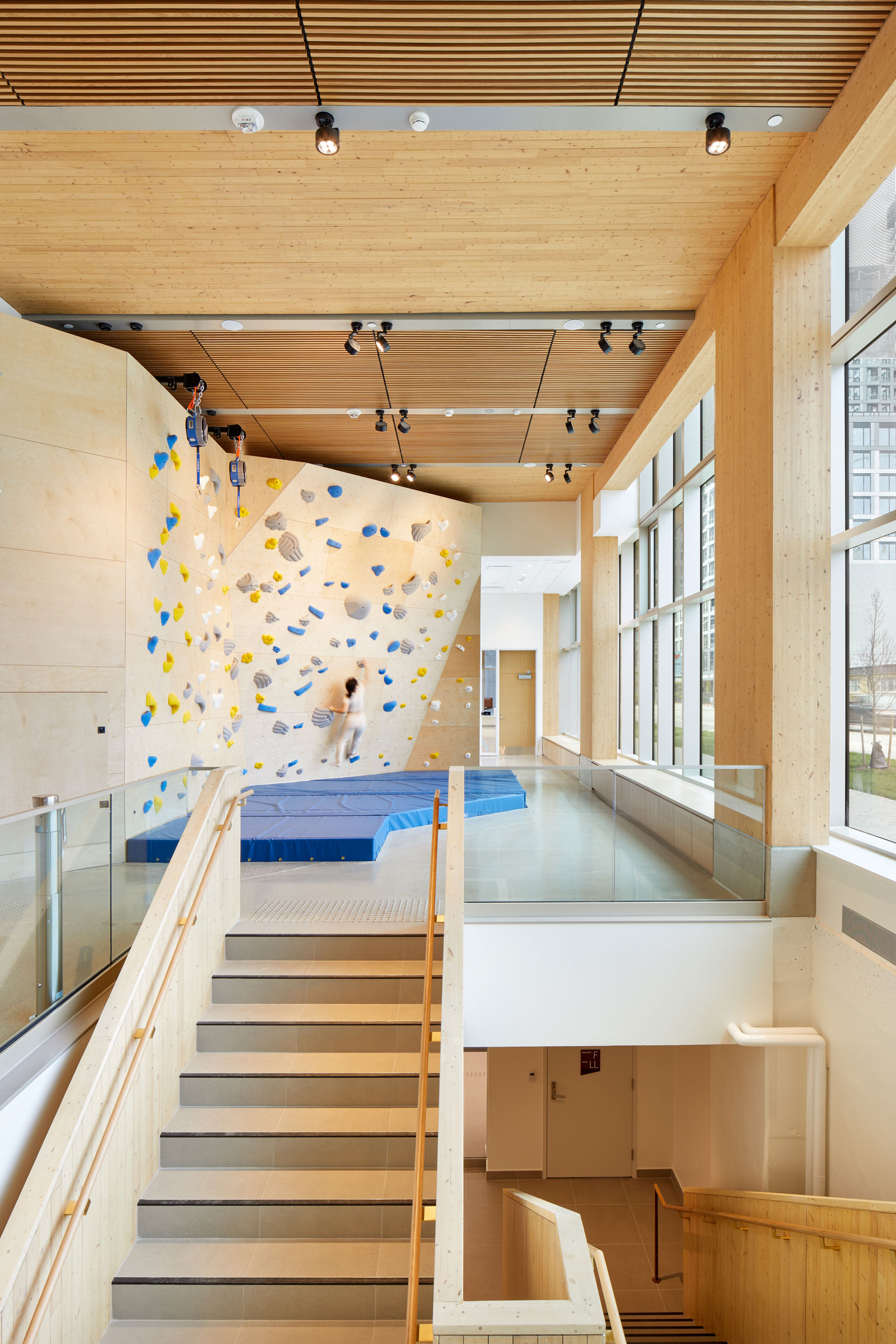 Limberlost Place is designed to fit 3,400 people at a time across its classrooms, offices, and recreational spaces. With such high occupancy comes certain regulatory challenges. “We had to go through a process of what’s called alternative compliance with the building code to demonstrate that our building was as safe as, if not safer than, conventional construction,” Phillips says.
