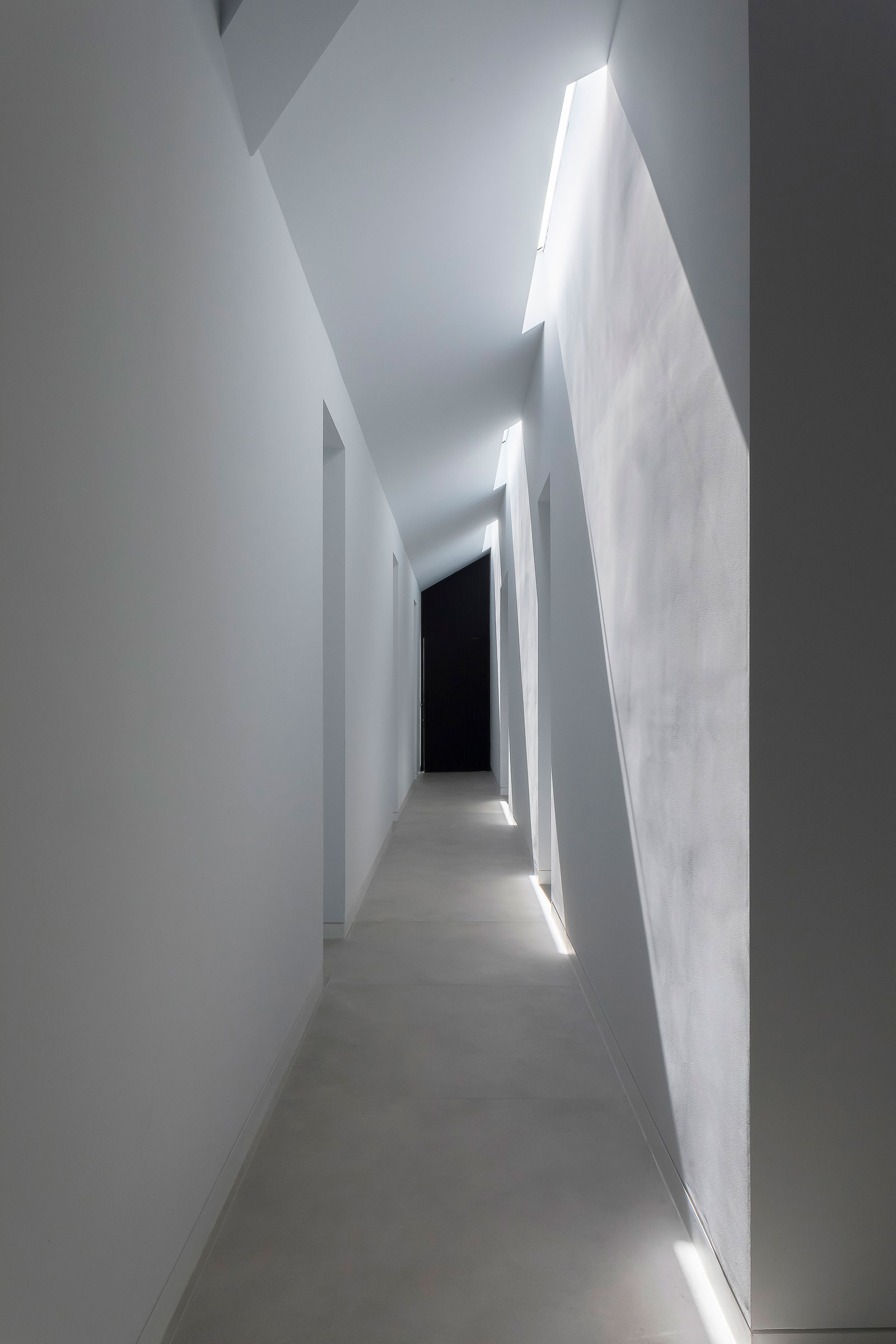 - Throughout the day bouncing light yields unique shadows in the home’s long corridor. Photo by Peter Landers
