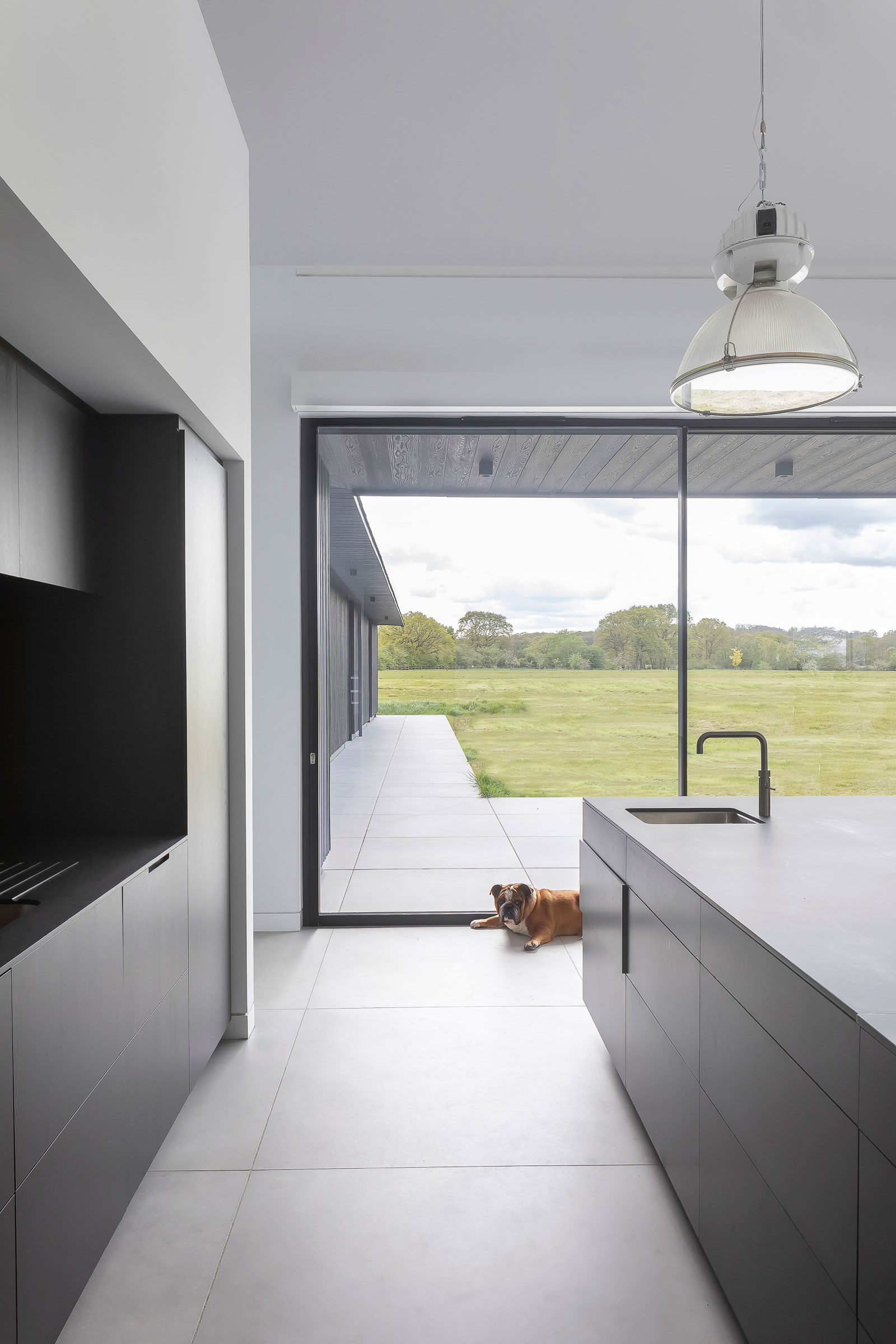 Its front facade is intentionally closed off and gives brief glances of the airy interiors through full-height niches and a corridor. Once inside, the connection to the meadow beyond can be fully appreciated. In the south-facing kitchen an 82-foot glass wall allows for panoramic views of the countryside, while a paved terrace and deep eaves make for sheltered spaces that can be enjoyed year-round.