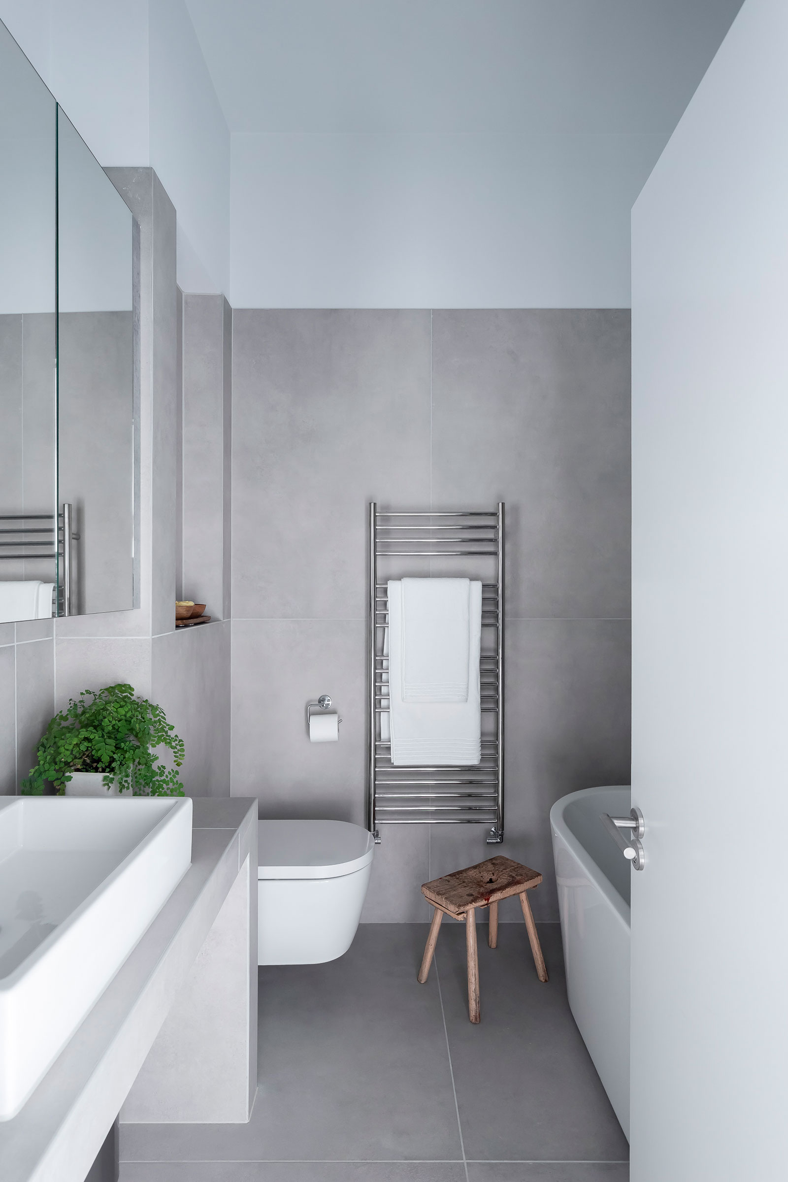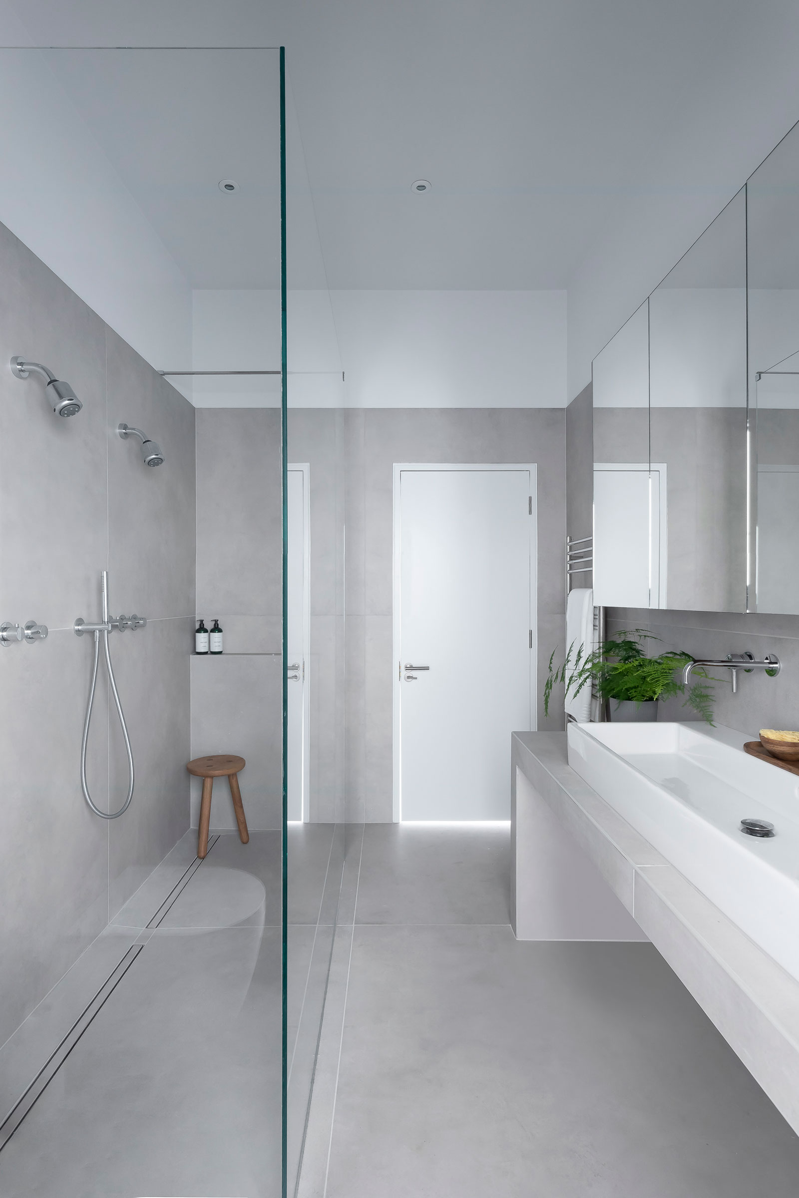 The palette was also key to making the home feel peaceful, with white walls, a matte black kitchen, and light gray porcelain tiles. “There’s something magical about the way the sun creates beams of light in the house, especially when it hits the roof light. It brings the space to life,” Mailen says. Strategically placed roof lights and full-height windows give way to an ever-changing dynamic between light and shadow.