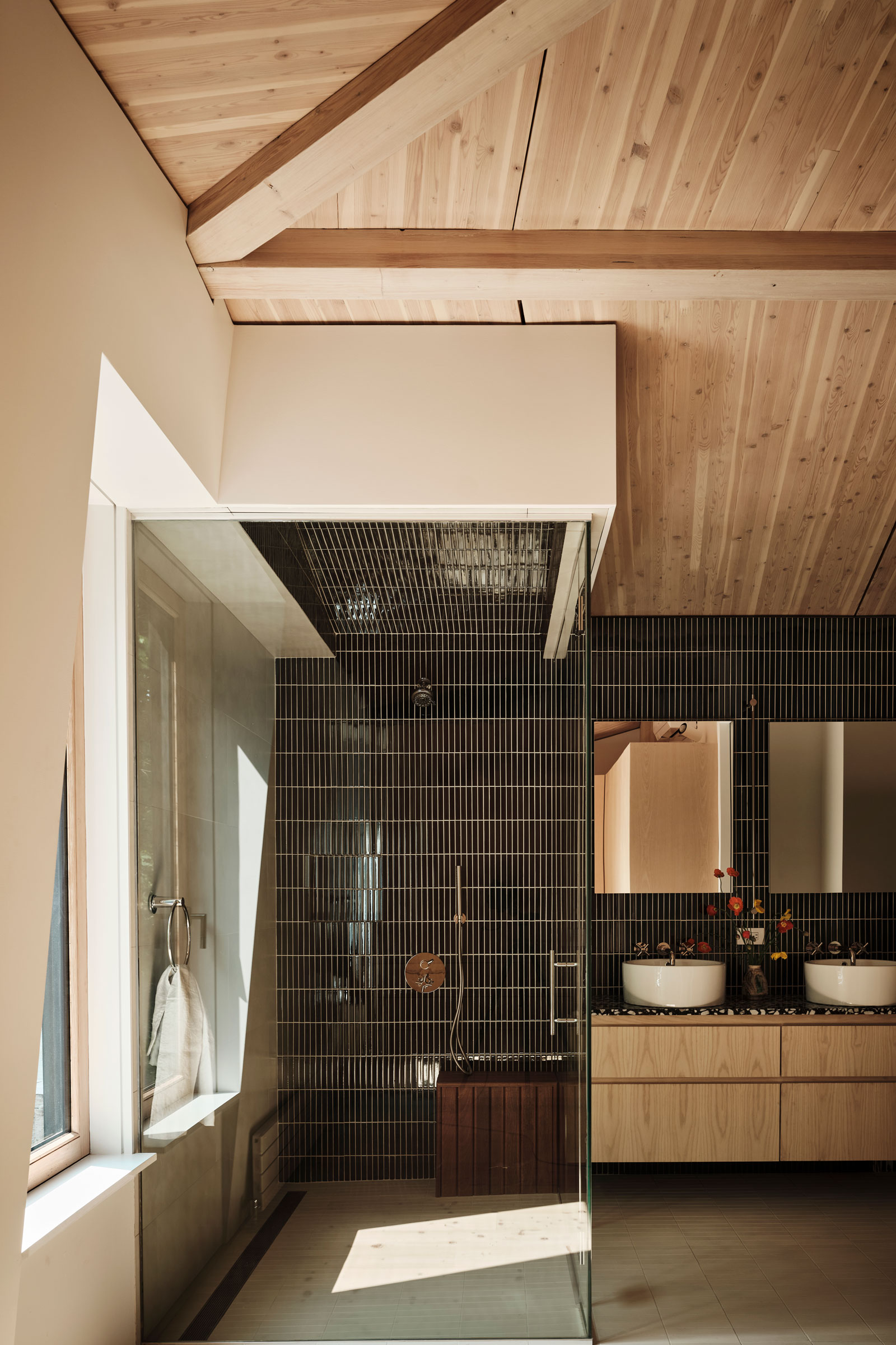 - The home’s main bathroom offers modern tile from Inax Tile against custom wood cabinetry, designed by Schiller Projects. Photo by Frank Frances