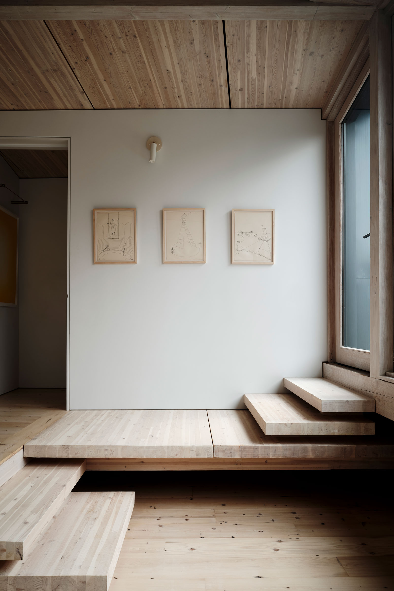 The studio also recycled components of the original structure, including the massive structural beams of old-growth North American timber that had sustained smoke and water damage over the years. “The old structure of the building is now the flooring of the completed building,” Schiller says. “We recycled the building inside the building.”