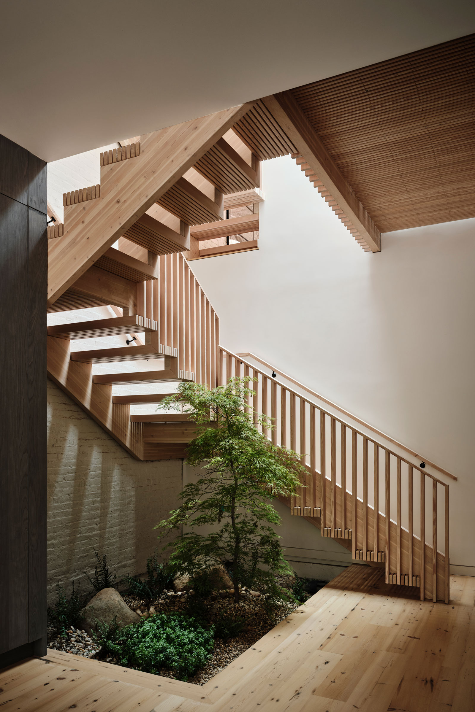 A striking three-story staircase made of glue-laminated Douglas fir ascends through the center of the house, illuminated by large skylight. At the bottom, the building’s former coal ash pit has been repurposed as an indoor garden. “There’s a Japanese maple growing in the middle of the house, which has the additional benefit of cleaning the air,” Schiller says.