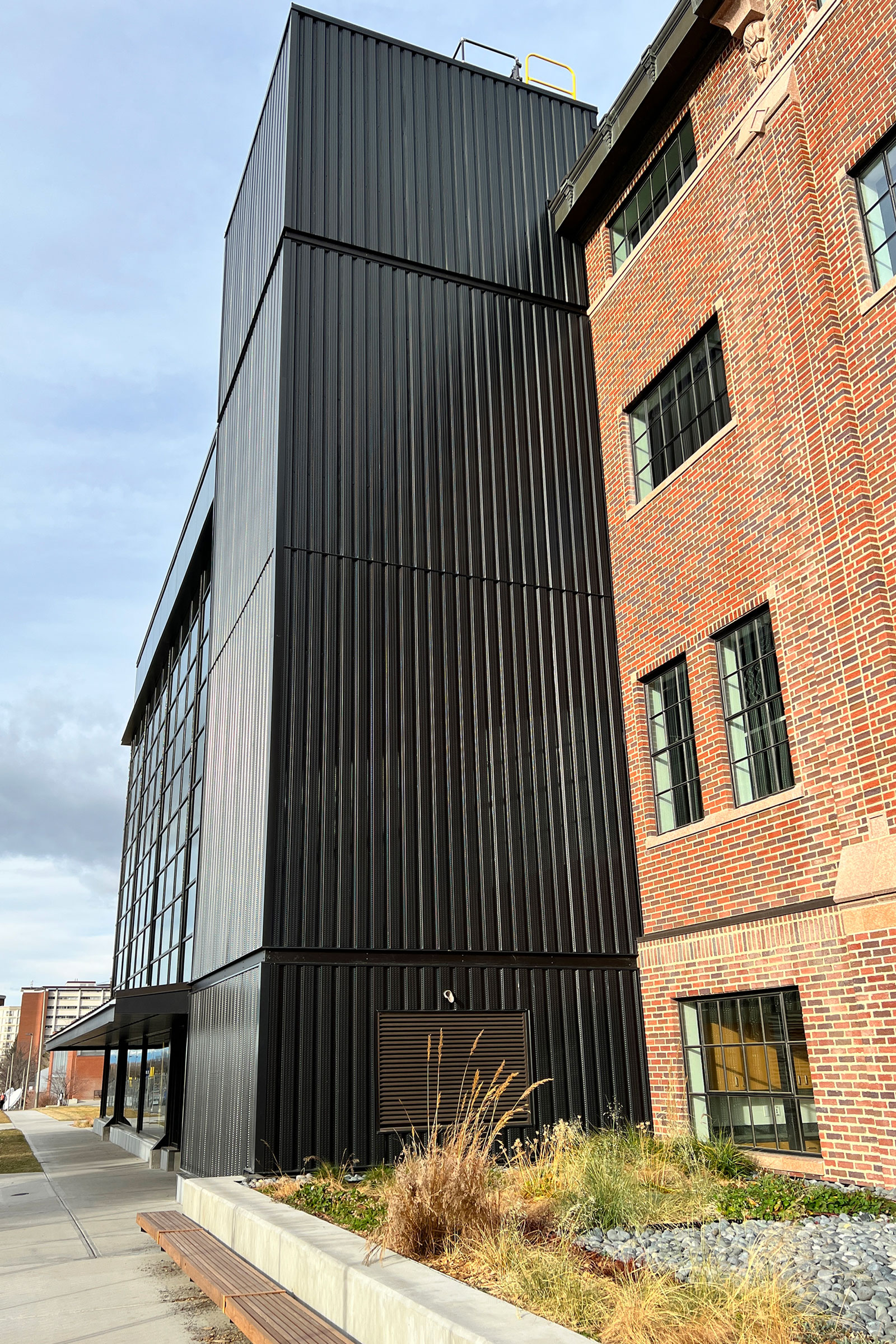 - The enclosure consists primarily of aluminum curtain wall, which provides a high degree of transparency to reveal the historic brick wall. The elevator shaft is clad in dark-colored perforated metal panel to capture solar-heated air, which is incorporated into the building’s HVAC system using SolarWall technology. Photo by Karl Neumann
