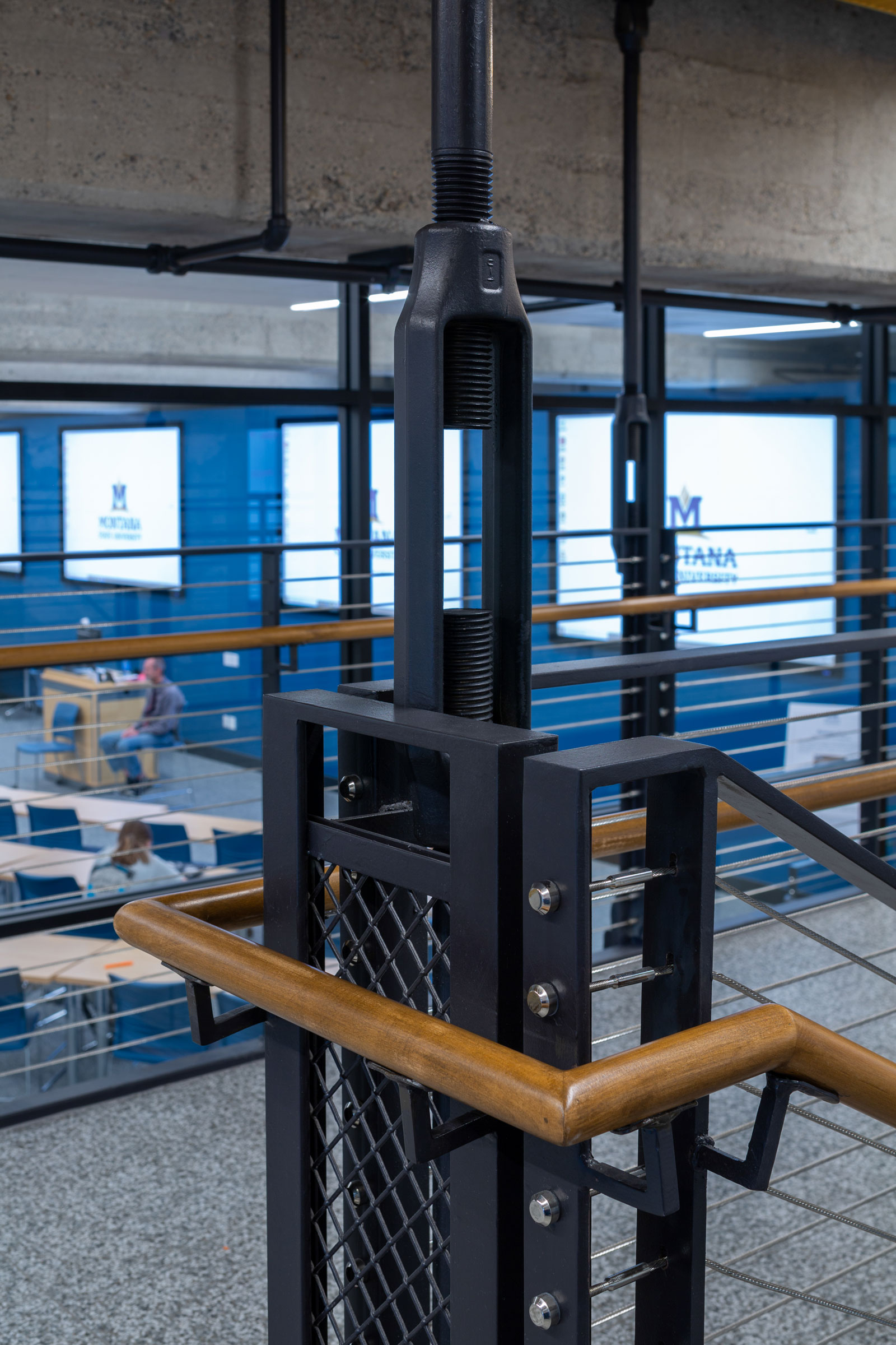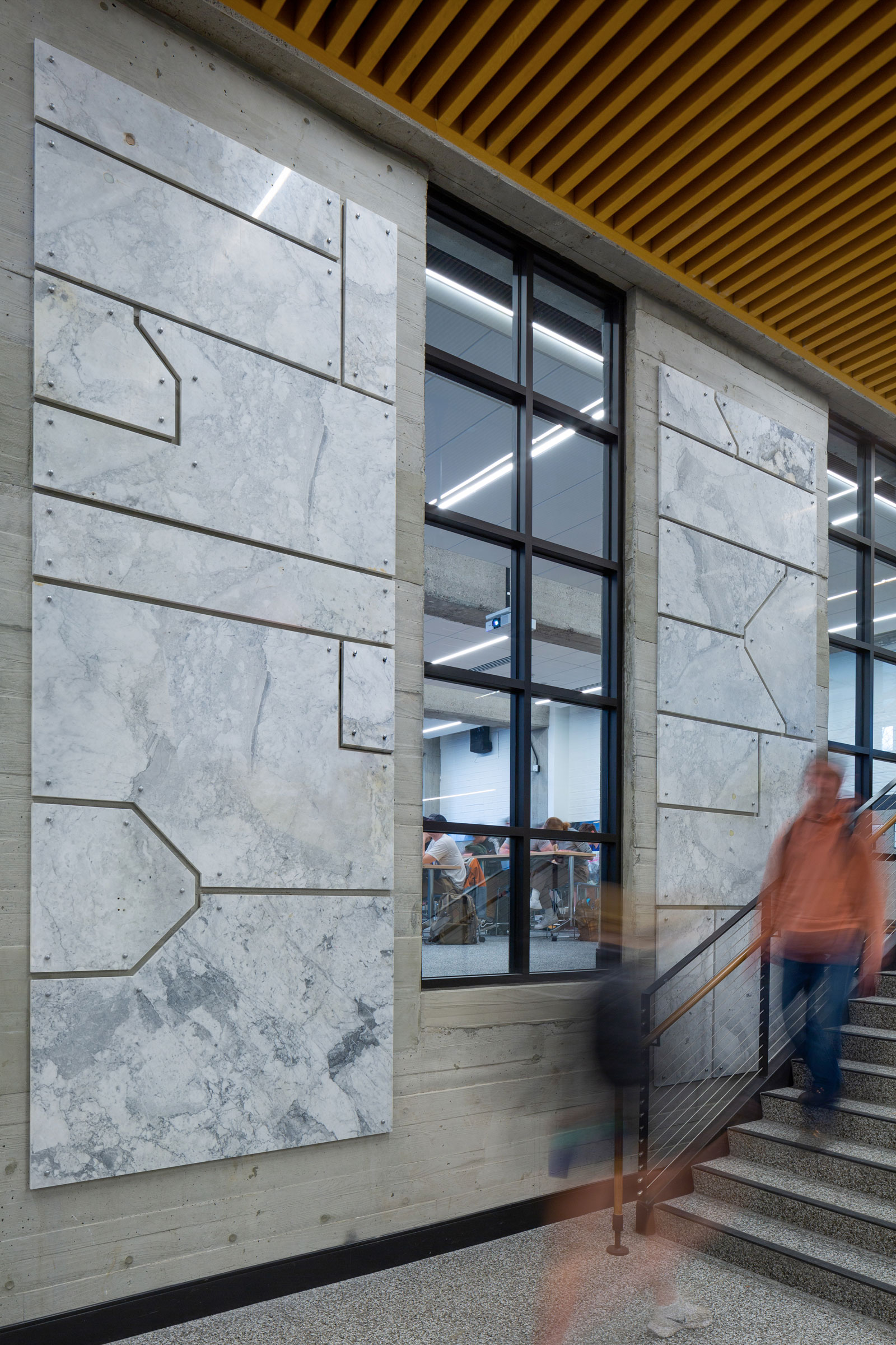 The original gymnasium balcony suspension rods and hardware at level four were left exposed, serving as a memory of past athletic events, and inspiring the detailed metal components for the new grade-level walkway, stairs, guardrails, and other interior elements.