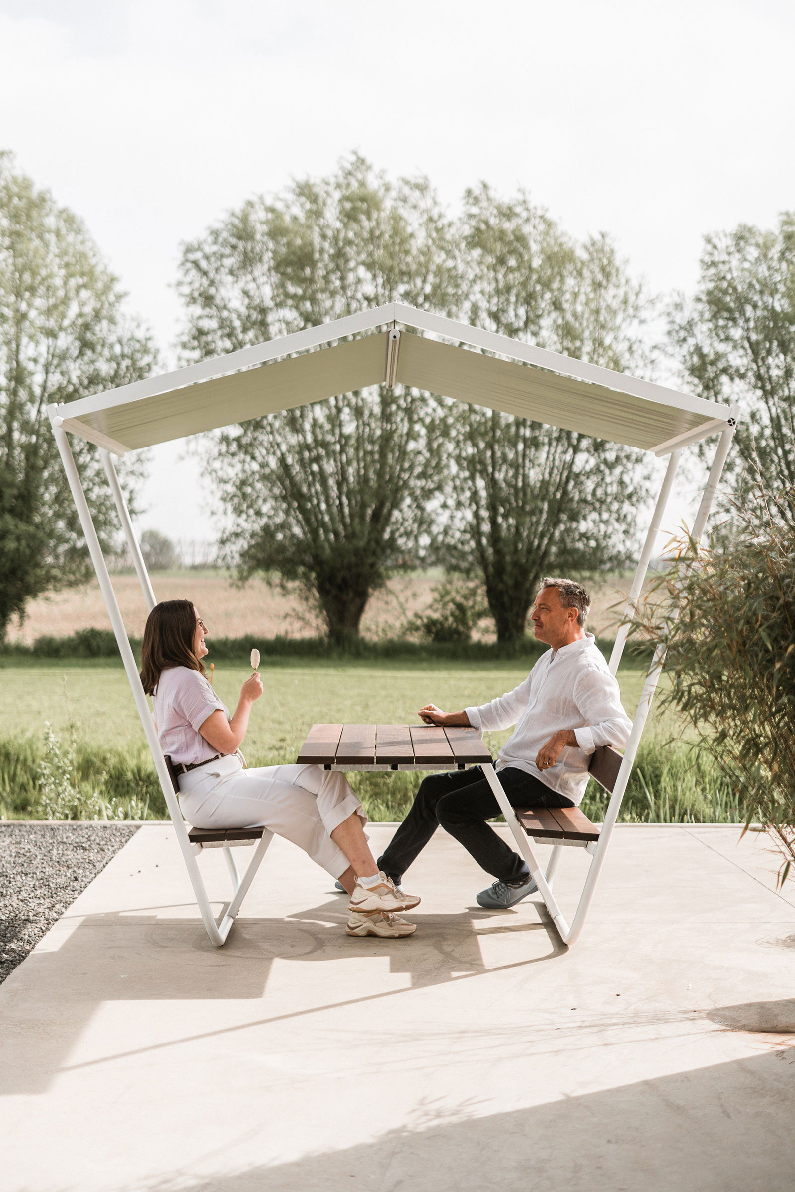 Experience endless modularity as an extension piece allows you to connect multiple tables side by side. An intuitive and protective shade system invites you to stay outside all year-round. Anchor the table to the ground, if you like. Inclusive design invites wheelchair users to easily sit at the head of the table.