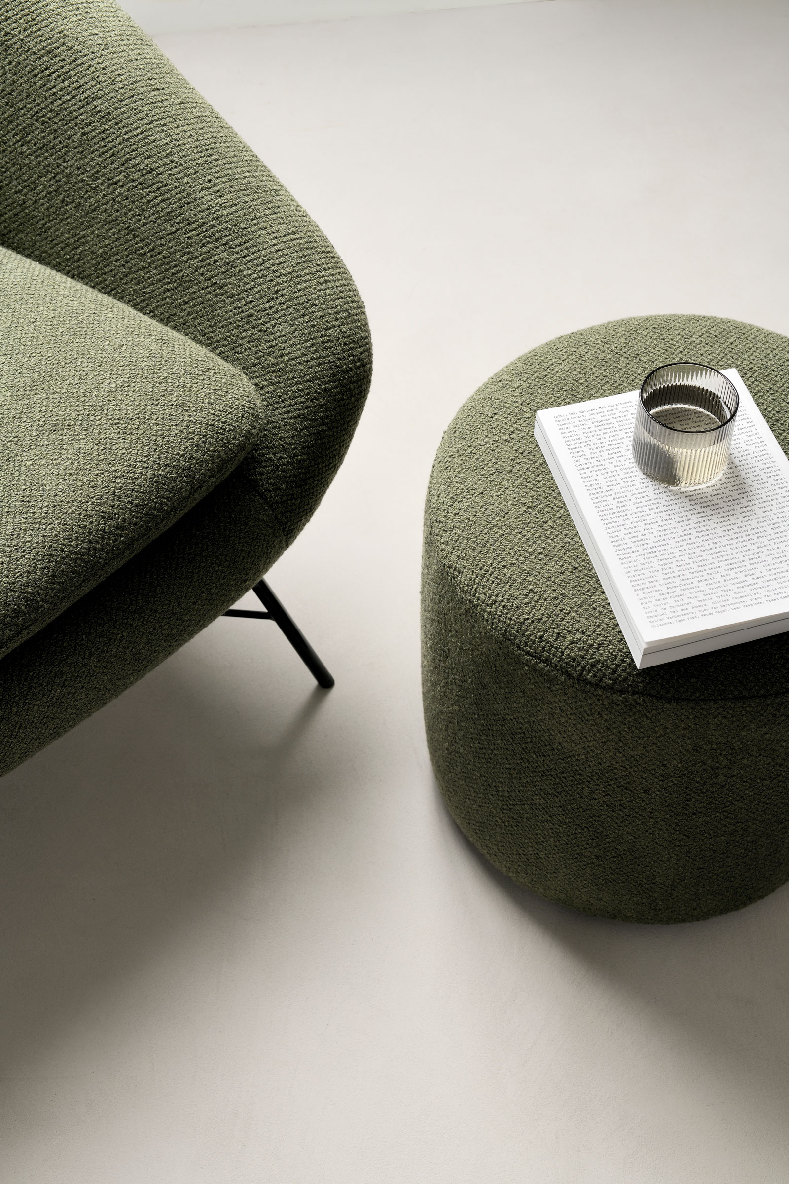 Once available in soothing off-white, warm copper, and energizing ginger colorways, the lounge chair and pouf are now available in an earthy, peaceful green.