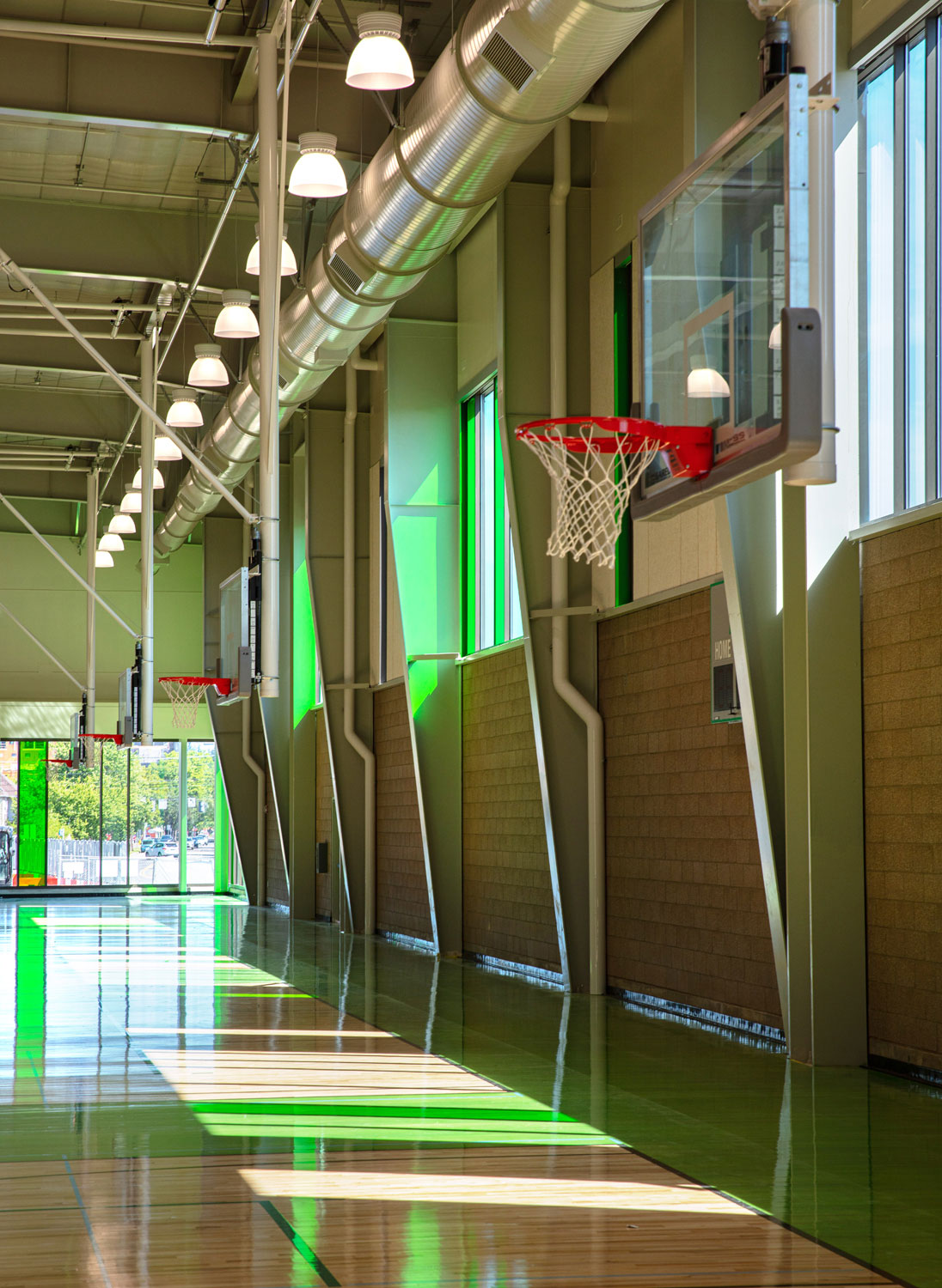 Aasum says daylight is the project’s most impressive sustainable feature, as the fieldhouse is sited to capture maximum natural light. “High, east-facing windows bring light in over the courts and create views through the courts from the upper-level office relight glazing,” he says. “Low glazing at the north and south of the courts visually extends the playing areas into the exterior courts and play areas. Supervision and safety are enhanced through this transparency, as well as the ability of the courts to function with 100% natural lighting. All electrical lighting is controlled with daylight sensors to automatically adjust lighting levels and save energy.”