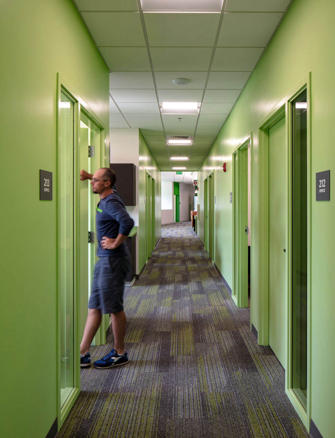 The project’s tight budget was both a challenge and an opportunity. The field house was built using a pre-engineered, Butler steel building system that provided a balance of structural and cost-efficiency, according to the architects. The simple modular structure meant the team could economically reimagine the building system to create room for “moments of delight” like the second-floor corner conference room, which dramatically projects out into the interior volume of the field house.