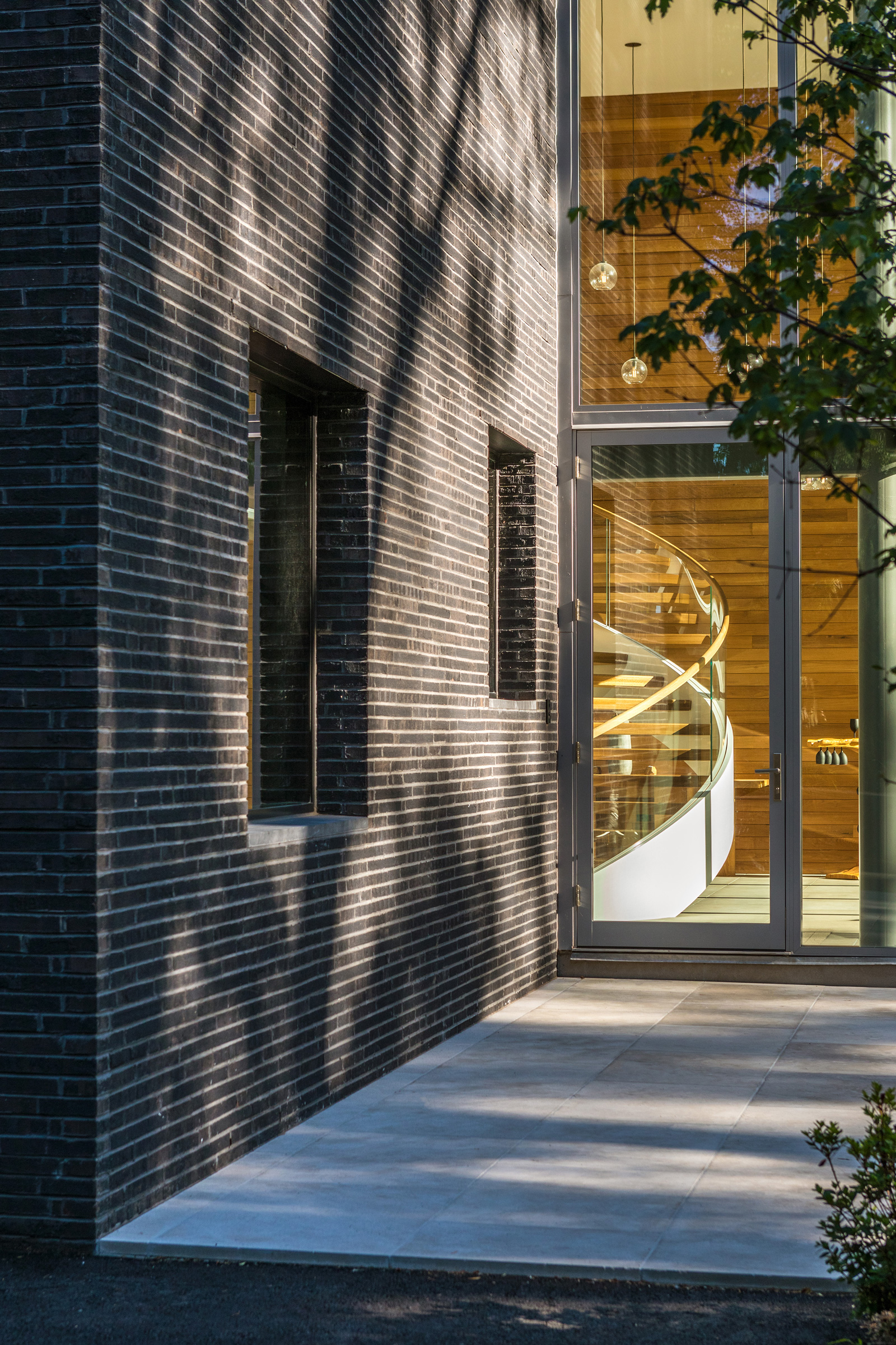 We wanted to bring a warm, inviting texture to the walls of the central space that contrasts the dark brick of the exterior masses. The material we chose is old growth teak, recycled from building demolition sites requiring no new trees to be cut. The carefully sealed building envelope coupled with thick insulated walls and insulated windows provide an airtight home that reduces the need for heating and air-conditioning.