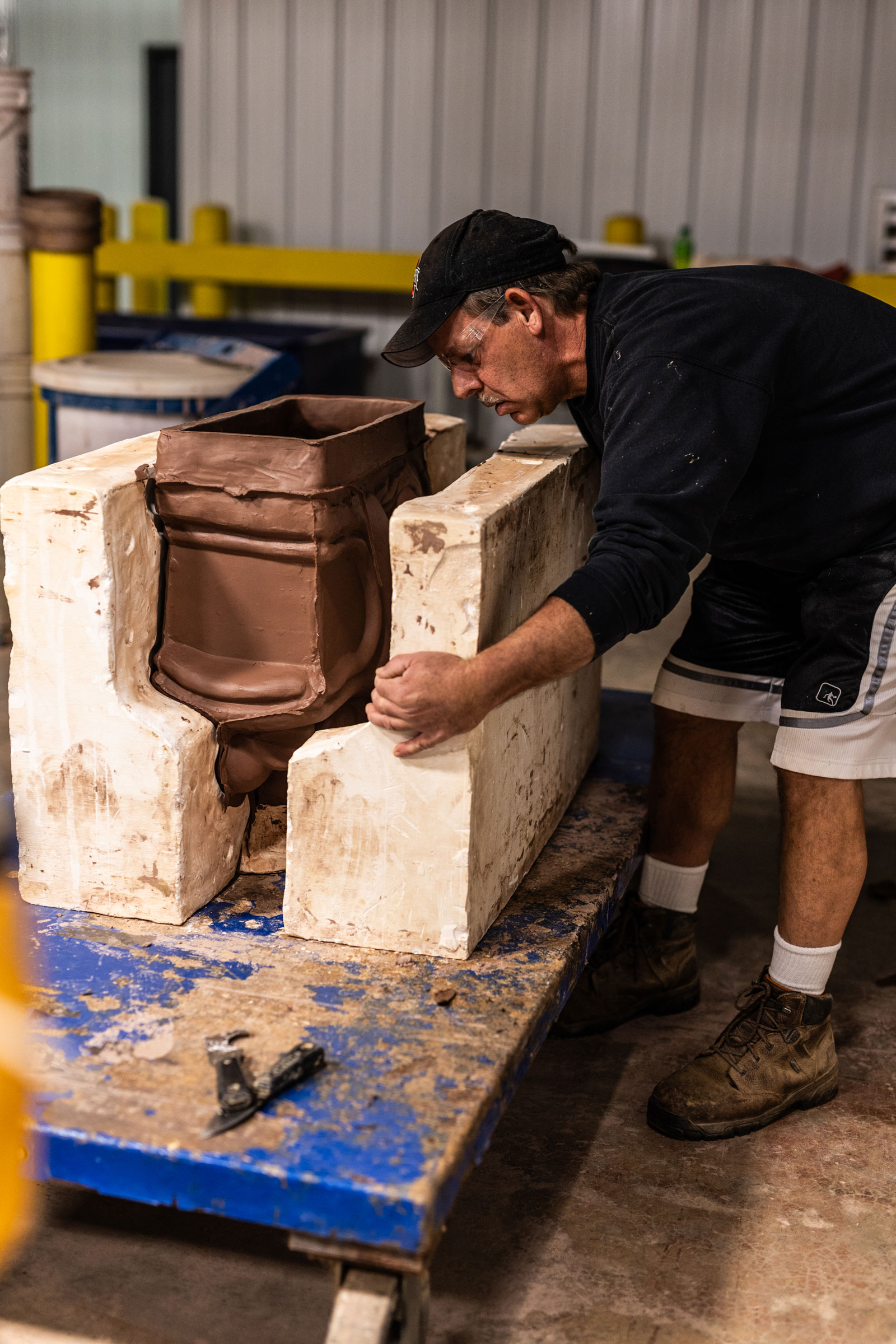 “We’ll then spray small clay chips with the glaze we’re considering. I’ll use a spectrophotometer, or color meter, to read the glaze. I’ll then assign a numeric value to the color and will compare that to the set standards we have for each glaze and determine how close it falls to our standards or if I need to make further adjustments,” he says. “Once we like the color we’ll repeat the process at a much larger scale, using larger mixers and giant tanks to hold the liquid and glaze. We’re working in the realm of 1,600 pounds of material—not including water.”