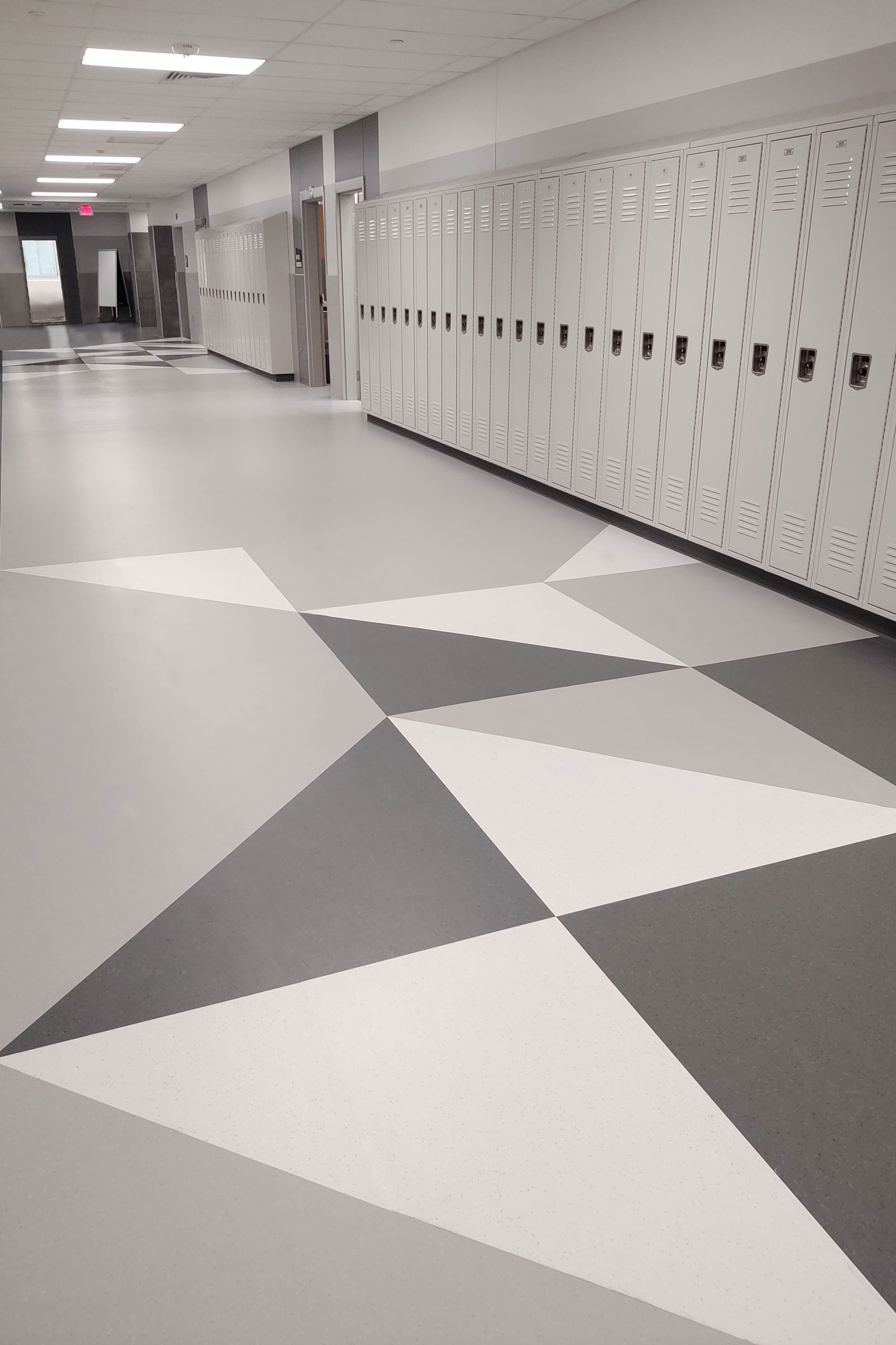- This new high school project features Roppe Envire Rubber Tile for its tonal chip look and was specified in white, smoke, and charcoal. The designer elevated the installation by cutting the 24-by-24-inch tiles in half diagonally, creating a unique aesthetic at the ends of the hallways that trails into the solid field color of the corridors. Photo courtesy of Roppe