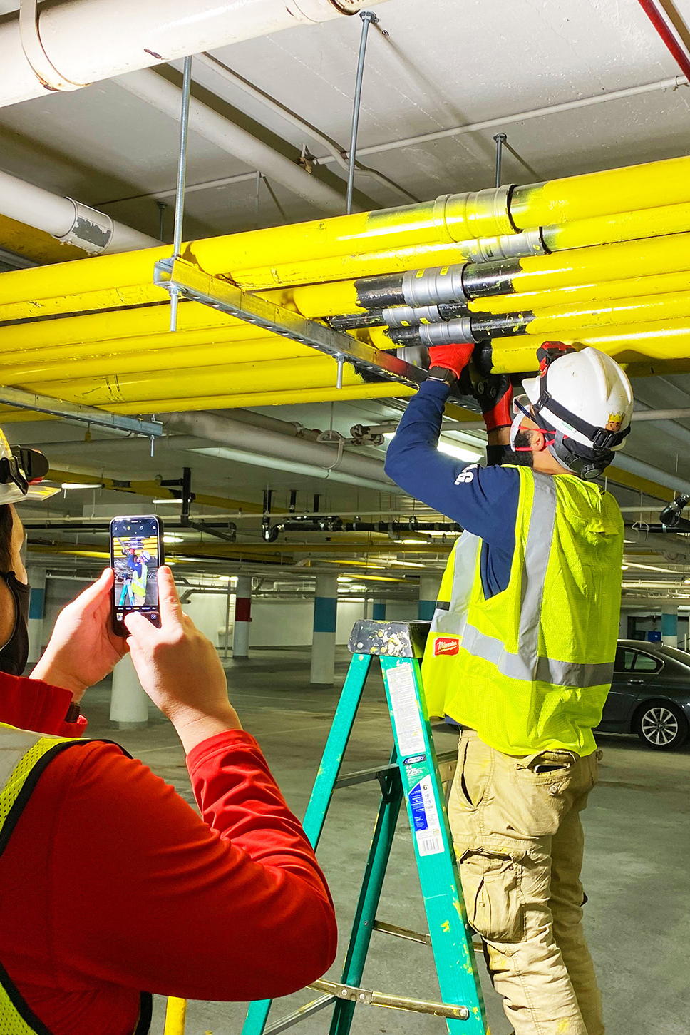 “When you typically thread a pipe, which would be something you’d use in place of MegaPress or as a traditional system, you actually remove the wall thickness. You’re making the piping thinner than it was before. And you’re taking off that protective coating. When you do that it starts to deteriorate. If something hits it it’s the first spot to break. It can loosen up over time and fail. Whereas with MegaPress we’re doubling that wall thickness. We have a Schedule 40 pipe, and then we’re putting a Schedule 40 fitting on top of that and pressing it so it’s actually more durable. Not only is it faster and safer; it’s more durable than it was in the first place.”