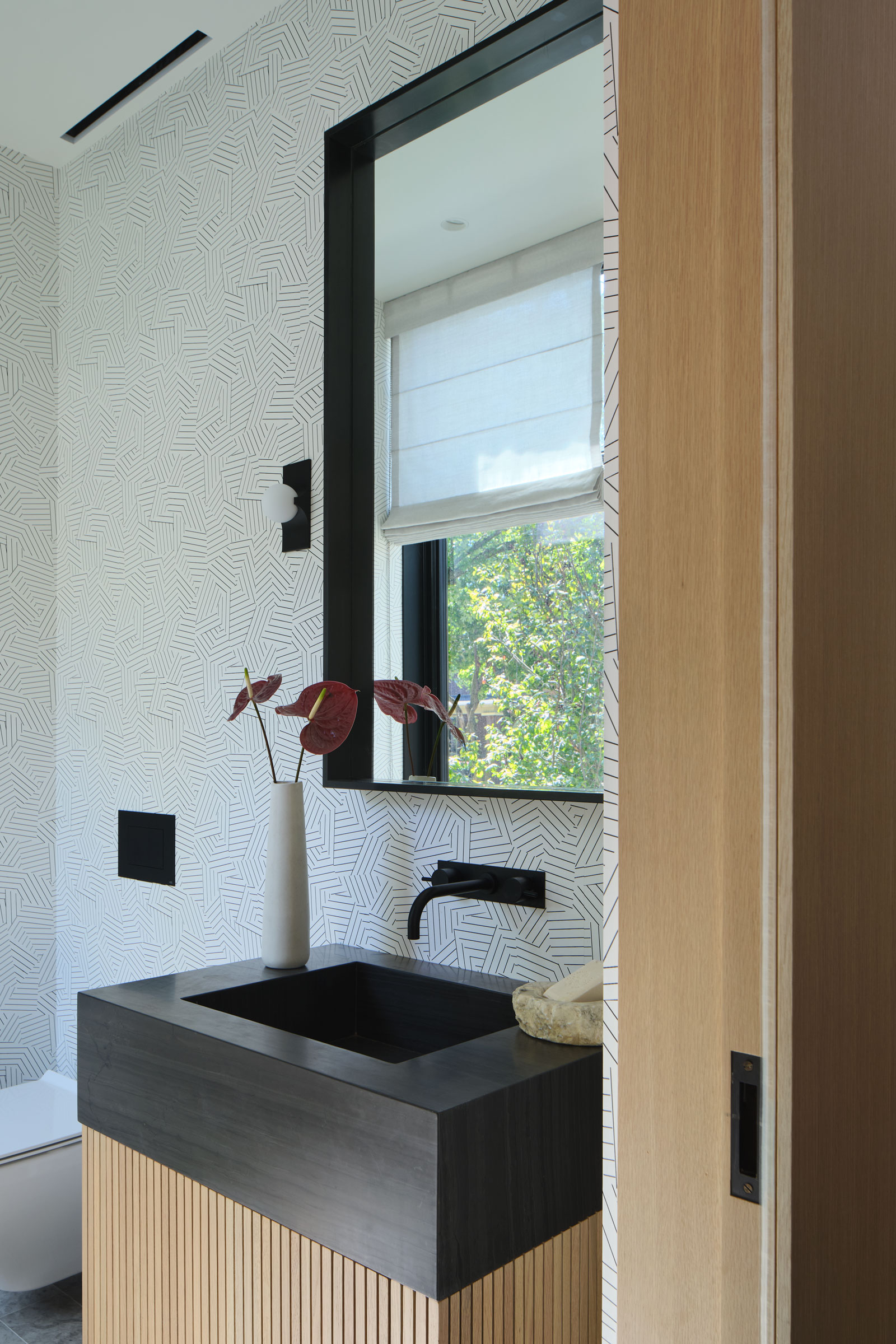 The client not only wanted to respond to the surrounding neighbors but also build a relationship to the natural environment in a district filled with mature trees that form a lush urban canopy. In response, the home’s design embraces biophilic principles throughout, creating deep connections between indoor and outdoor spaces.