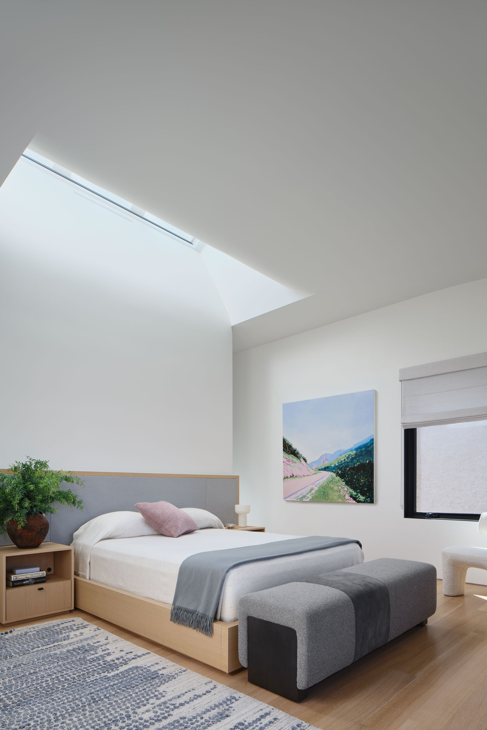 This philosophy influenced everything from material choices to the multi-level landscape design, which terraces down from the main living space to create a varied garden experience. The design team, including Boyster, who was completing a master’s in biomimicry at the time, incorporated nature-inspired elements like curved ceiling transitions on the top floor, which echoes organic forms and creates a softer, loftier, and brighter experience as you move up through the home.
