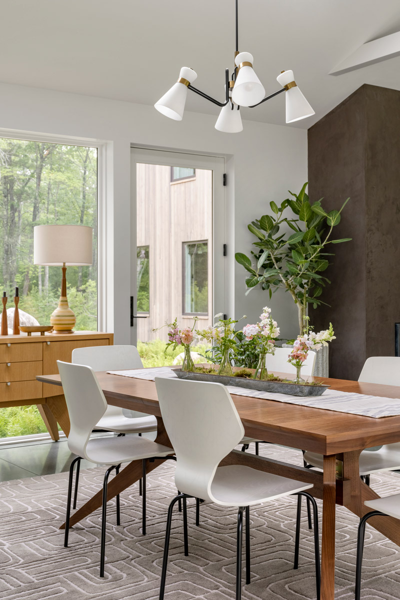 “Our site-specific design angled the house just east of south for ideal solar exposure, while the primary living space was situated toward a sunny lawn space against a wooded edge,” Carroll says.