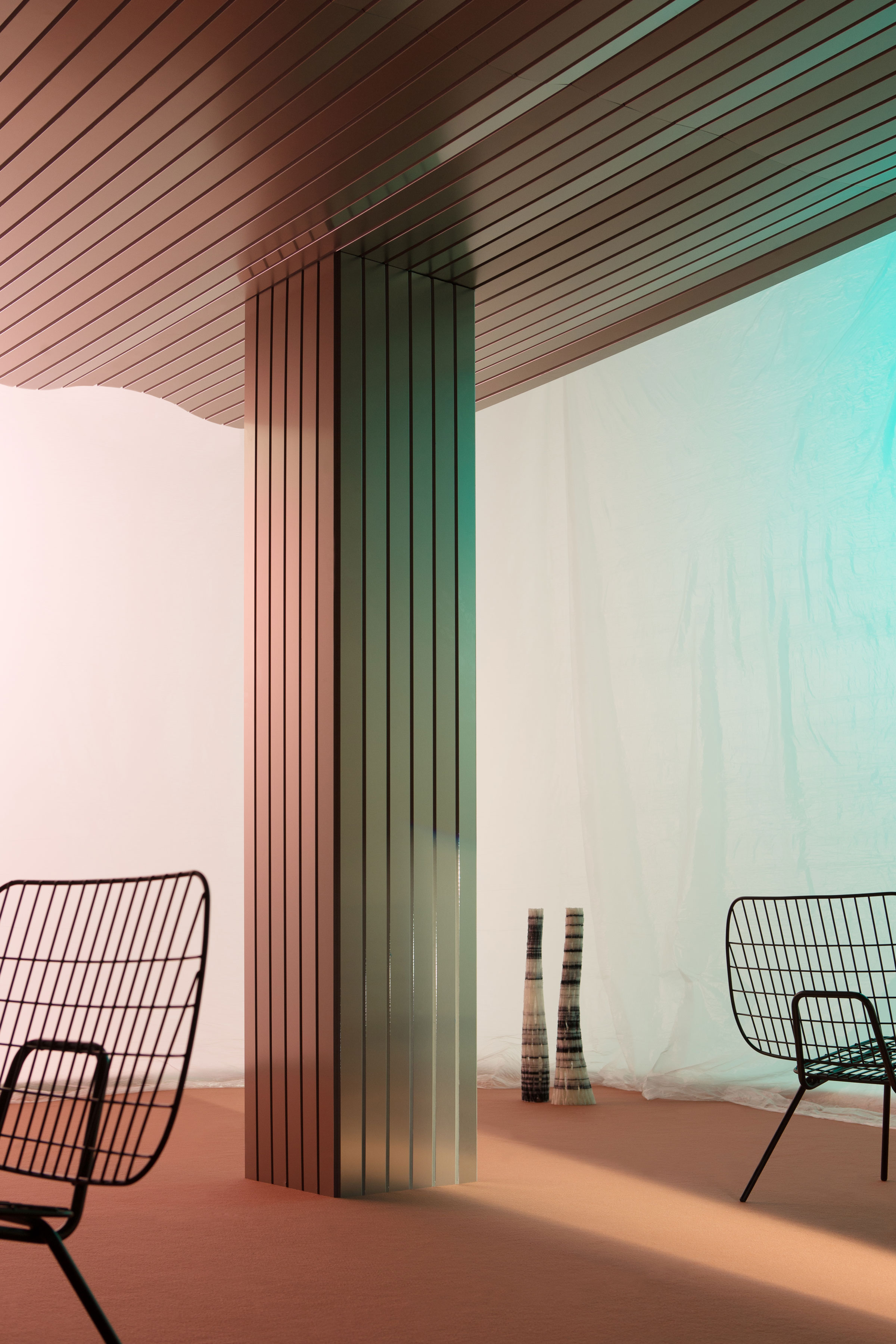 With Mesh Sheets, you can create sleek, 3D membranes using rigid materials like wood or aluminum while achieving the look and feel of lighter, flexible materials like paper or fabric. Considering the varied size of the facets and the parametric nature of the product, its curve radius can be very tight while still maintaining fluidity.