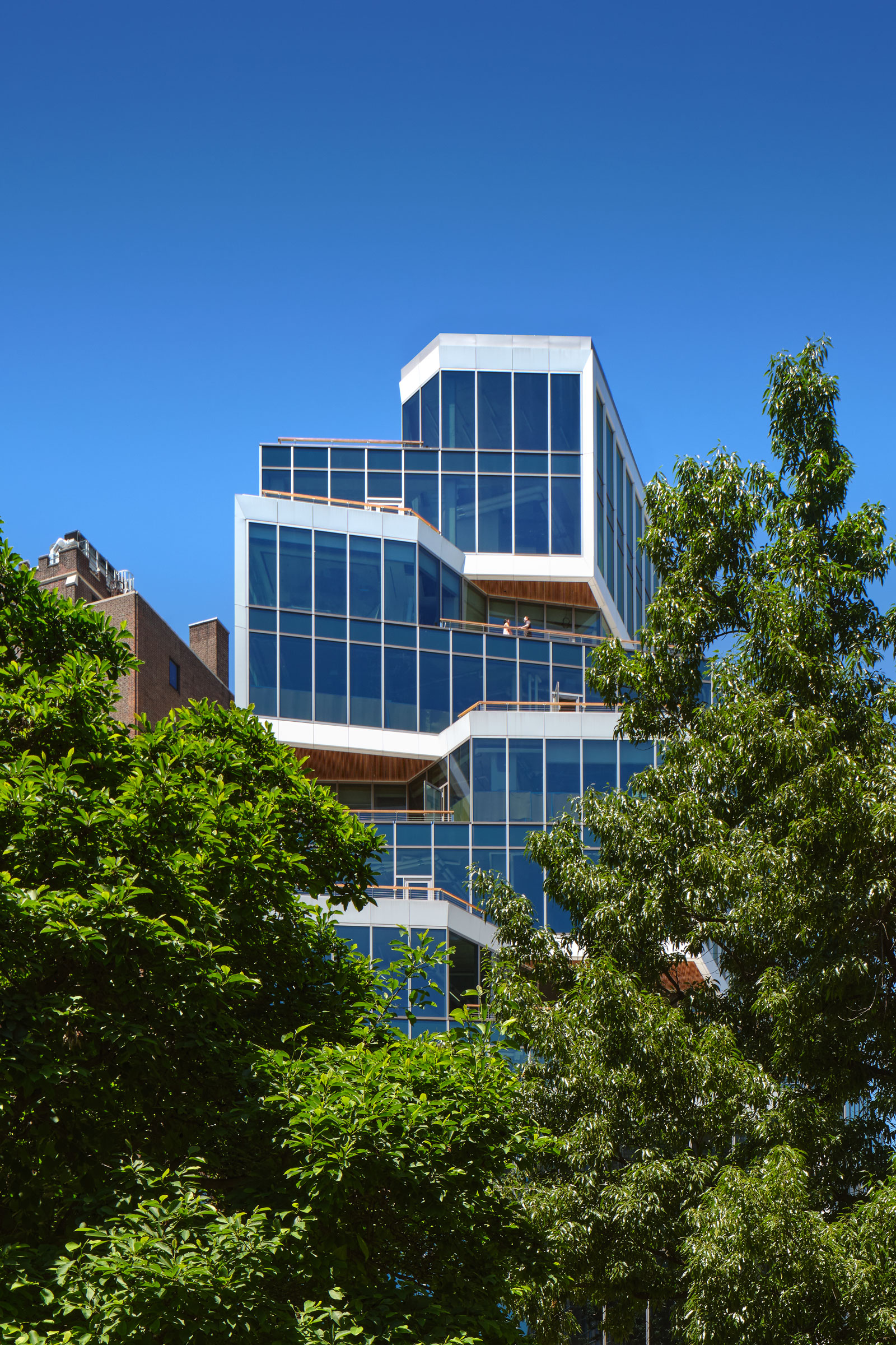 “As you can imagine tenants want to see the view, which means they want to have a lot of glass,” Goodwin says. “We wanted to design something that was not all glass.” They wanted to respect the local character of Greenwich Village. The white panels break up the facade of glass windows while ensuring the building stands out from the typical “glass box” typology.