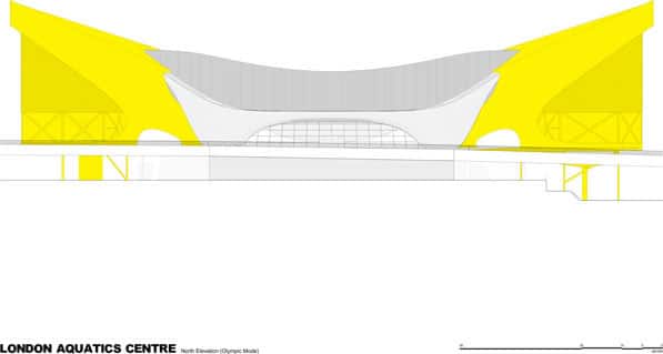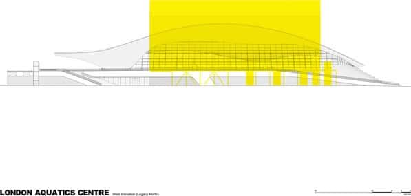 - This elevation shows the building’s extra wings, which will be shed after the Olympic games in order to transform into a right-sized swimming facility for the neighborhood.