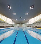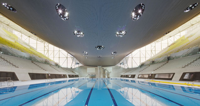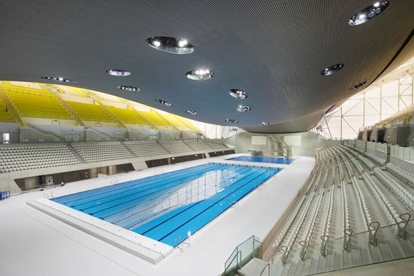 Fluidity was a key design element for Zaha Hadid and her team, seen here in the shape of the concrete diving platforms, curving up from the floor. A lot of concrete was used, but the architects used a most sustainable cement replacement for much for it. Photo: Hufton + Crowe.