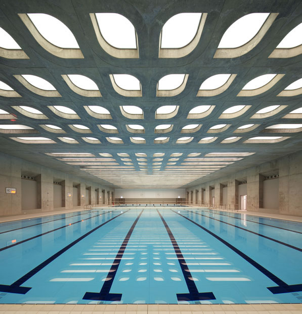- The competition pool is the typical 50 meters. Above it rolls the roof like a giant wave, its slats made from FSC-certified red lauro wood, which is highly durable and moisture resistant.